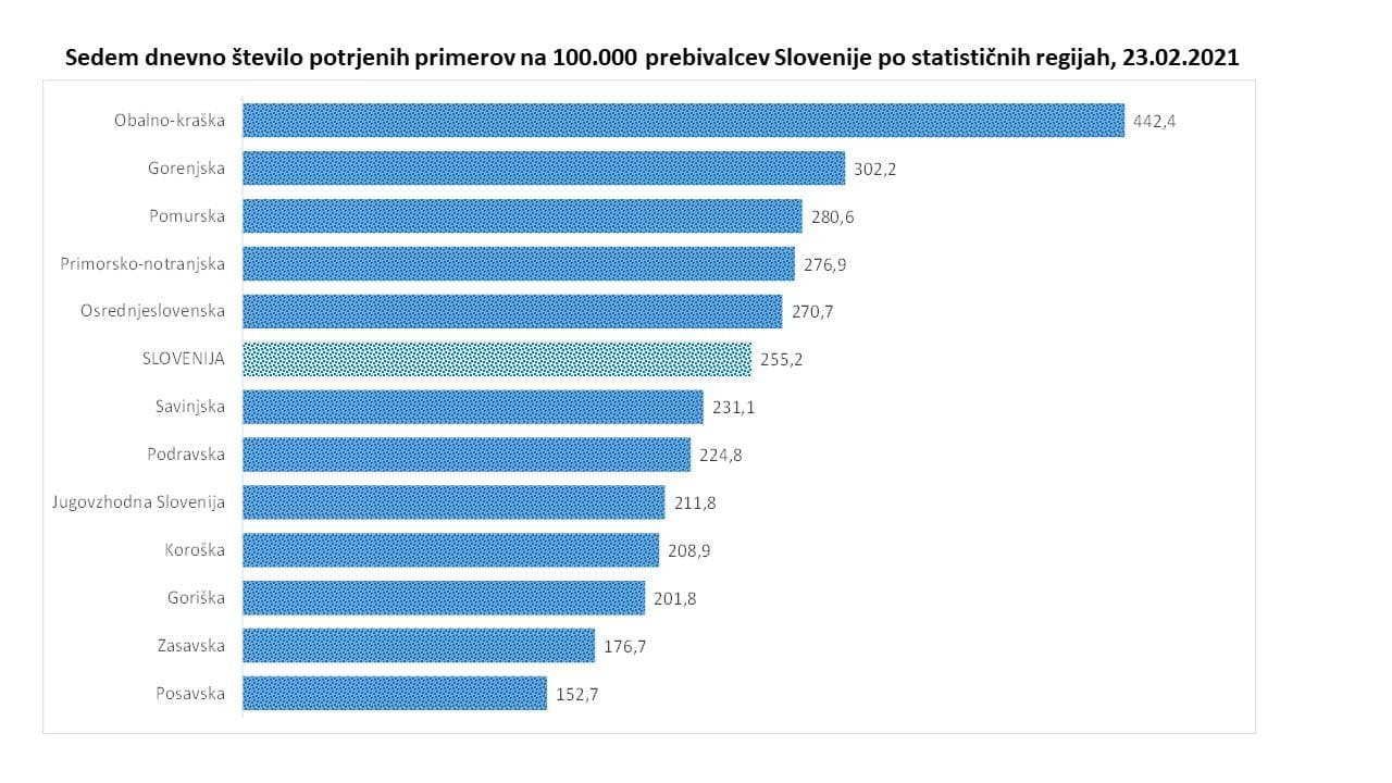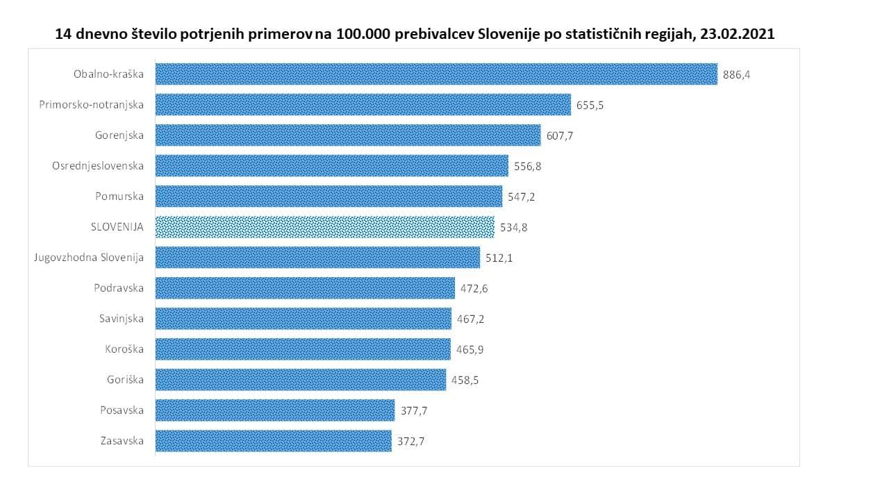 14-dnevno število na sto tisoč prebivalcev na ravni države znaša 534,8, še vedno ostajajo najslabše razmere v Obalno-Kraški regiji, ki ima tudi najvišjo incidenco. Najnižja 14-dnevna incidenca pa je v Zasavski regiji. 7-dnevna incidenca na ravni države pa znaša 255,2, kar je podobno kot včeraj, je pojasnila Bratuša.