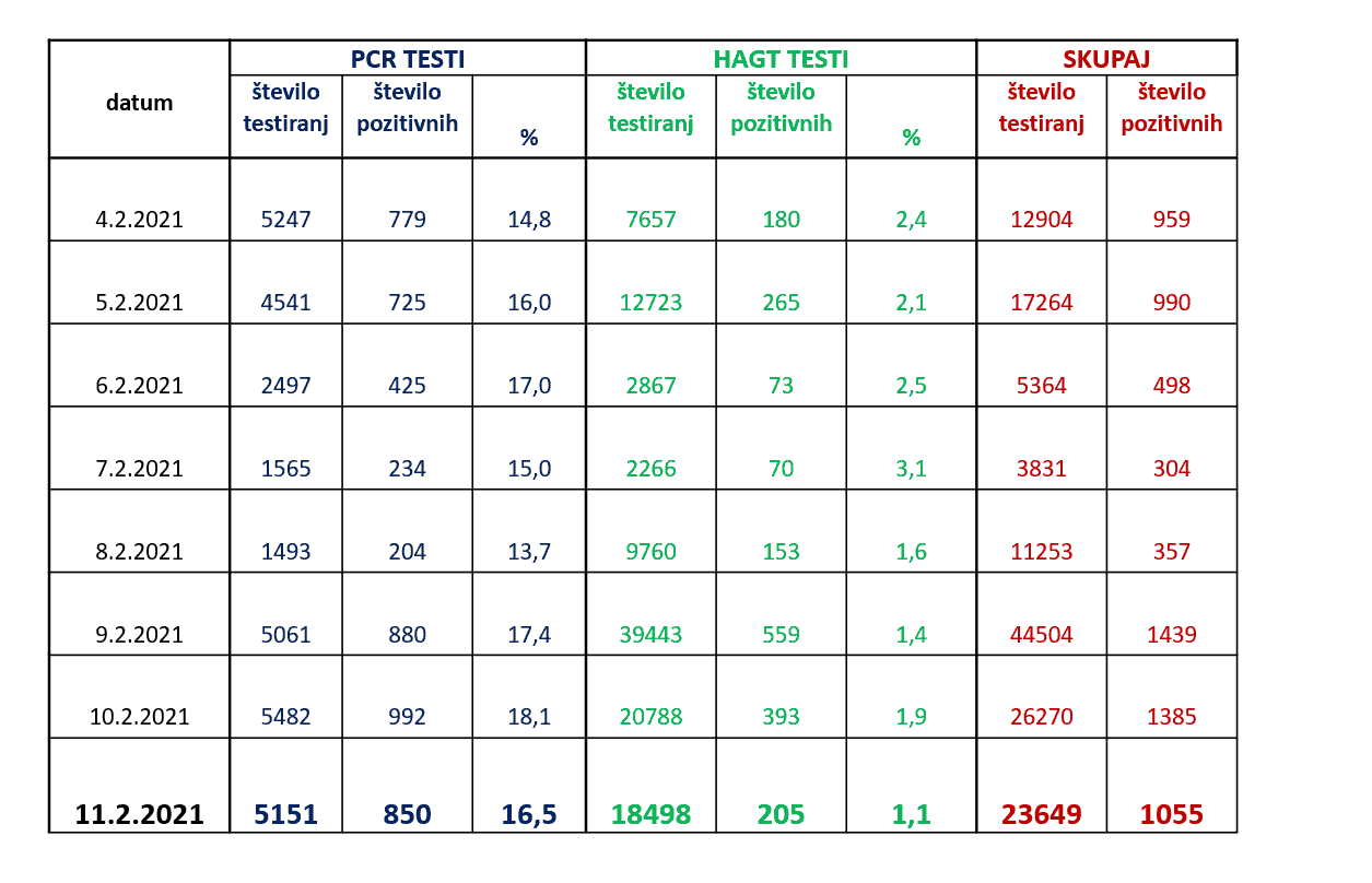 V četrtek so v Sloveniji opravili 23.649 hitrih in PCR testov ter z njimi potrdili skupno 1055 okužb z novim koronavirusom. Opravljenih je bilo 5.151 PCR testiranj. Z njimi je bilo potrjenih 850 novih okužb, kar pomeni, da je delež pozitivnih PCR testov znašal 16,5 %. Opravljenih je bilo tudi 18.498 hitrih antigenskih testov. S hitrimi testi so potrdili 205 novih okužb, je pojasnila Bratuša.