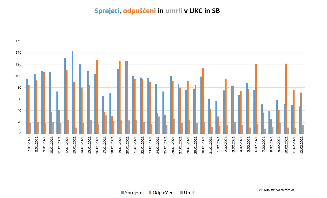 Skupaj je bilo sicer včeraj v bolnišnice sprejetih 47 pacientov, 71 pa jih je bilo iz bolnišnic odpuščenih. V naši največji bolnišnici v UKC Ljubljana se danes zdravi 253 COVID pacientov, od tega 42 na intenzivni terapiji.