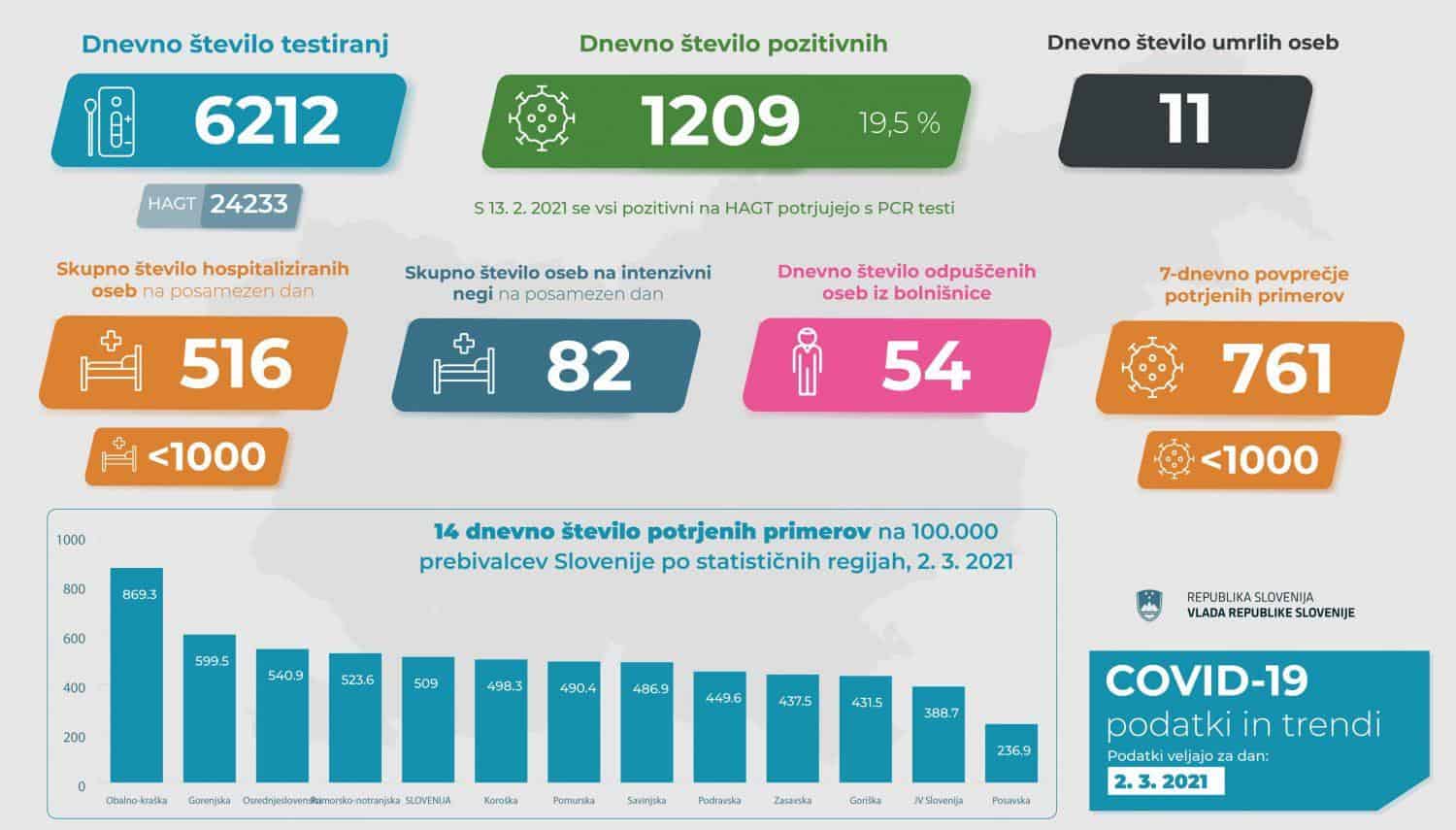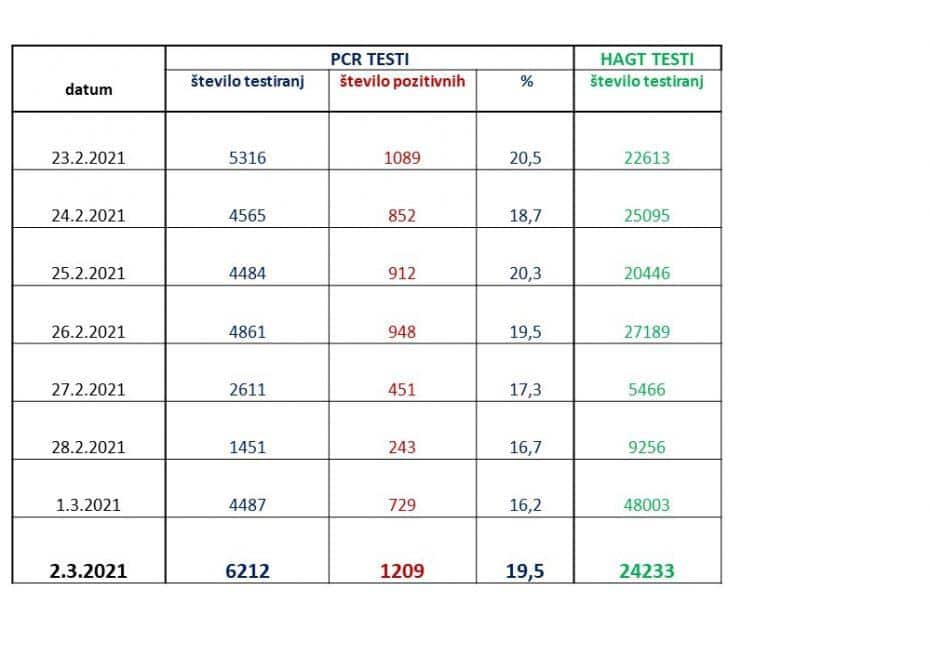 Včeraj je bilo opravljenih 6.212 PCR testiranj in 24.233 hitrih antigenskih testov. S PCR testiranji je bilo včeraj potrjenih 1.209 novih okužb.