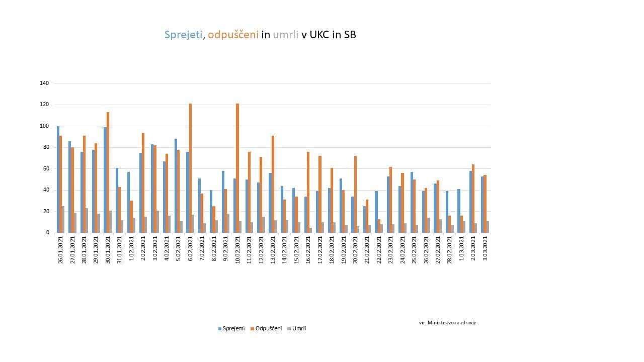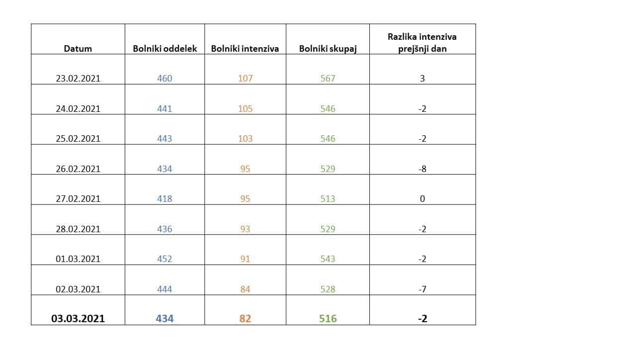 Danes se v bolnišnicah zdravi 516 covid pacientov. Na intenzivni terapiji se zdravi 82 pacientov, 2 manj kot včeraj. Skupaj je bilo včeraj v bolnišnice sprejetih 53 in odpuščenih 54 pacientov. Umrlo je 11 oseb.