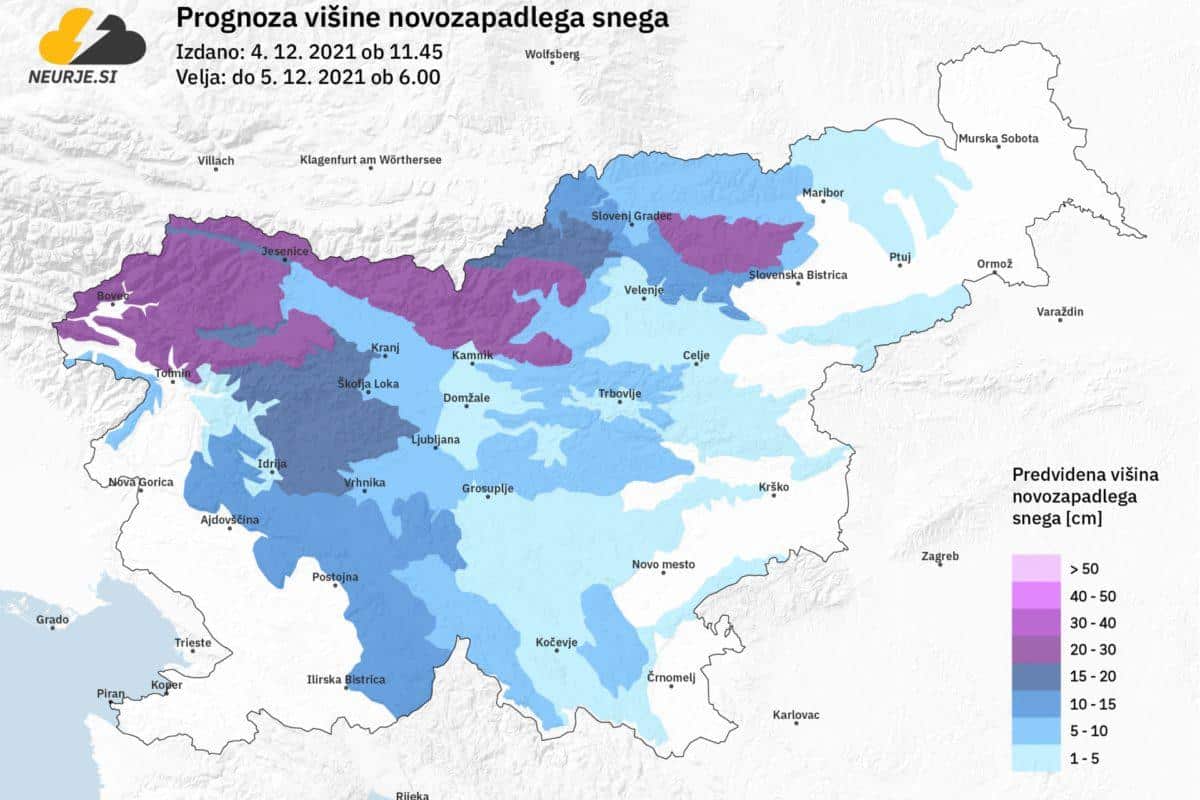 V hribih bo ponovno zapadlo od 20 do 40 cm novega snega, po nižinah pa bo snega večinoma le za vzorec ali pa še to ne, saj bodo tla razmočena, sneg pa bo ob pozitivnih temperaturah moker in težak (“južen”), še napovedujejo na Neurje.si.