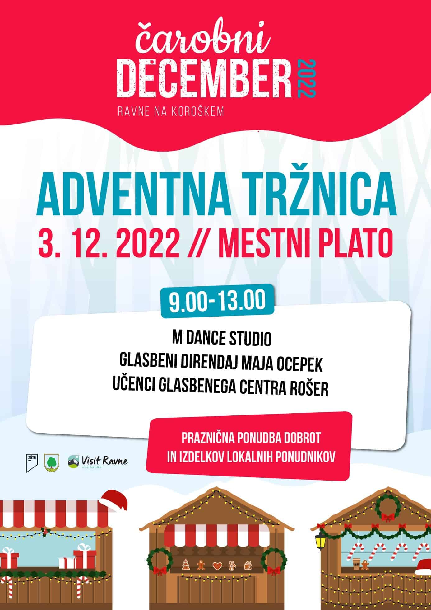 Adventna tržnica se bo odvijala pred Tušem na mestnem platoju med 9.00 in 13.00. V času tržnice bodo nastopili plesalci plesne šole M-dance studio, otroci iz Glasbenega direndaja Maje Ocepek in učenci Glasbenega centra Rošer.