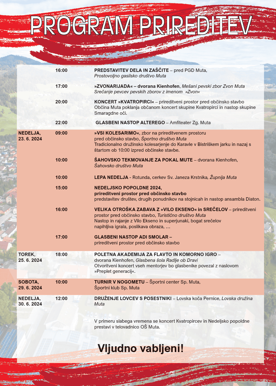 V Občini Muta se že od torka 11. junija 2024 vrstijo različni dogodki, športni, kulturni in glasbeni. V soboto je za glasbeno doživetje poskrbela skupina Kvatropirci ter Alterego, danes v nedeljo, 23. junija 2024 pa bo na sporedu: