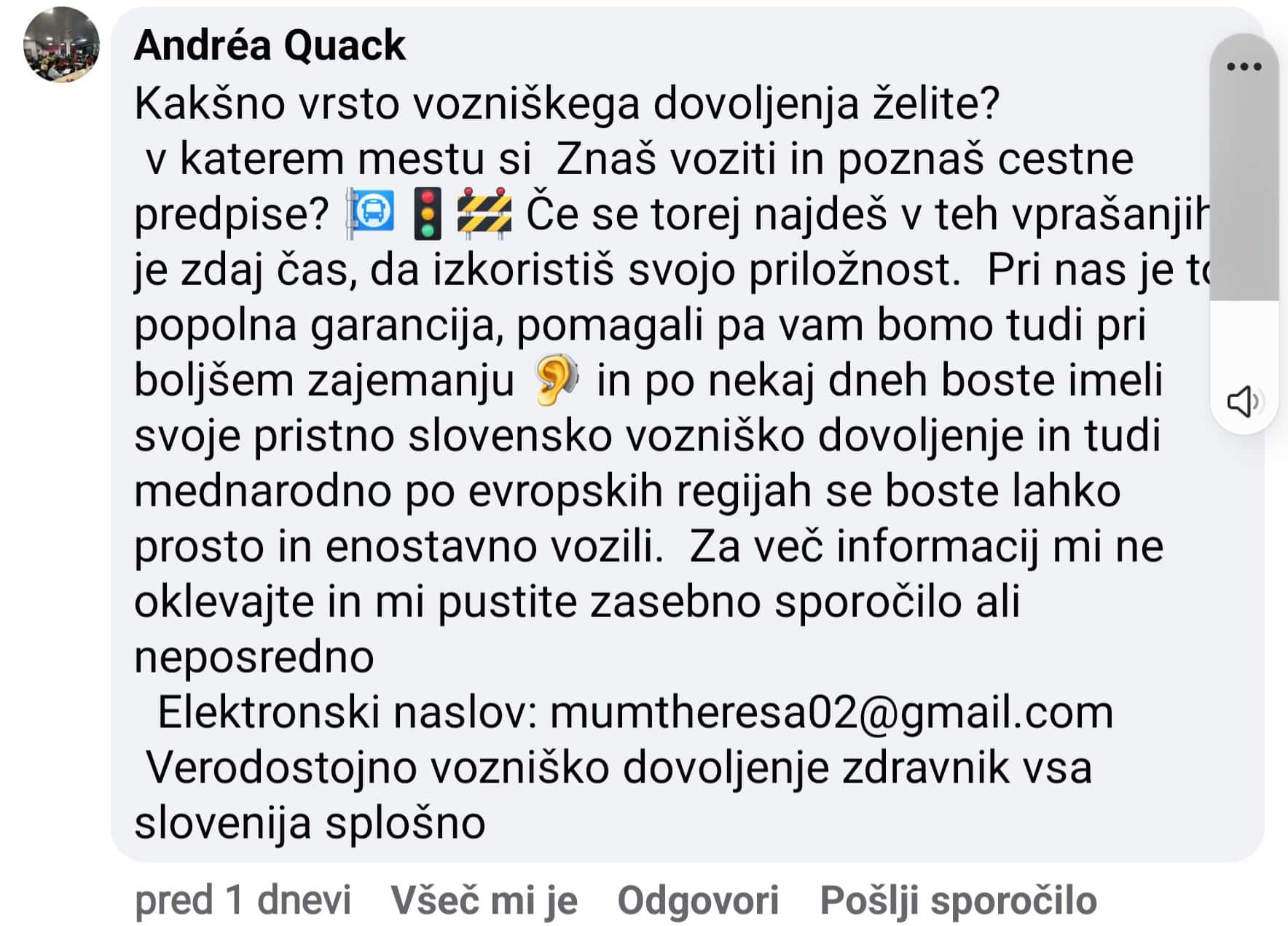 V sodelovanju z Agencijo za varnost prometa Republike Slovenije so v zadnjih dneh zaznali, da so se na družbenem omrežju Facebook pojavili zapisi (po vsebini oglasi), kjer posamezniki, proti plačilu ponujajo pridobitev slovenskih in mednarodnih vozniških dovoljenj. Ob nekaterih zapisih kjer ponujajo omenjena vozniška dovoljenja, so dodali tudi fotografije policijskih preventivnih dogodkov, ki so bile objavljene na družbenih omrežjih.