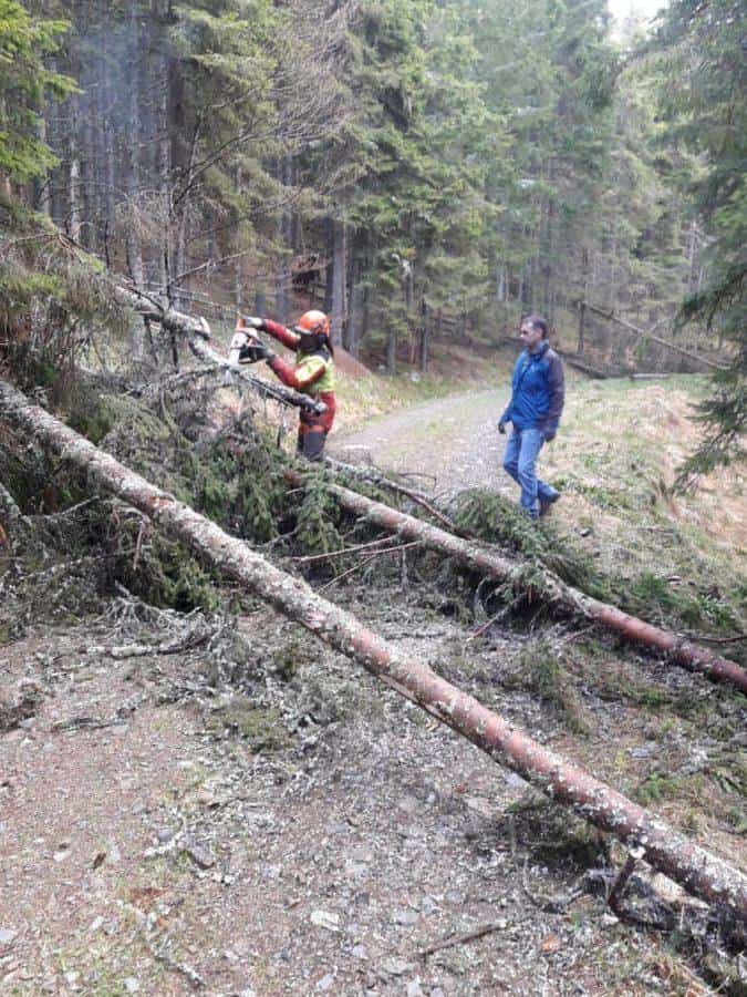 Razdeljeni v dve skupini so odstranili podrta drevesa, ki so ob snegolomu padla na planinski poti in onemogočala varno hojo.
