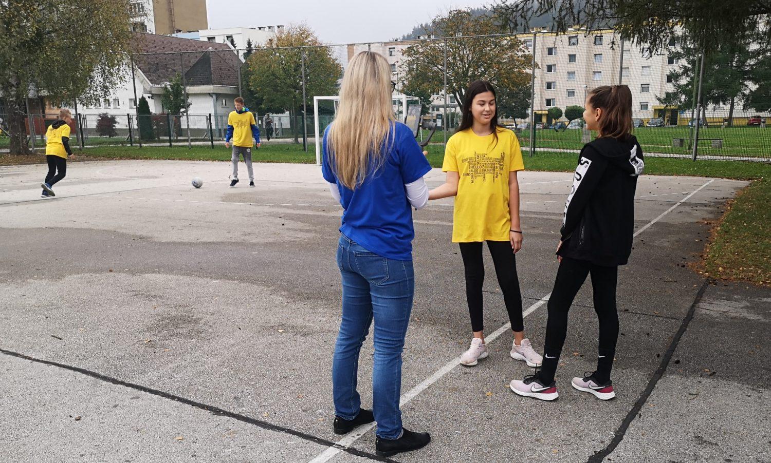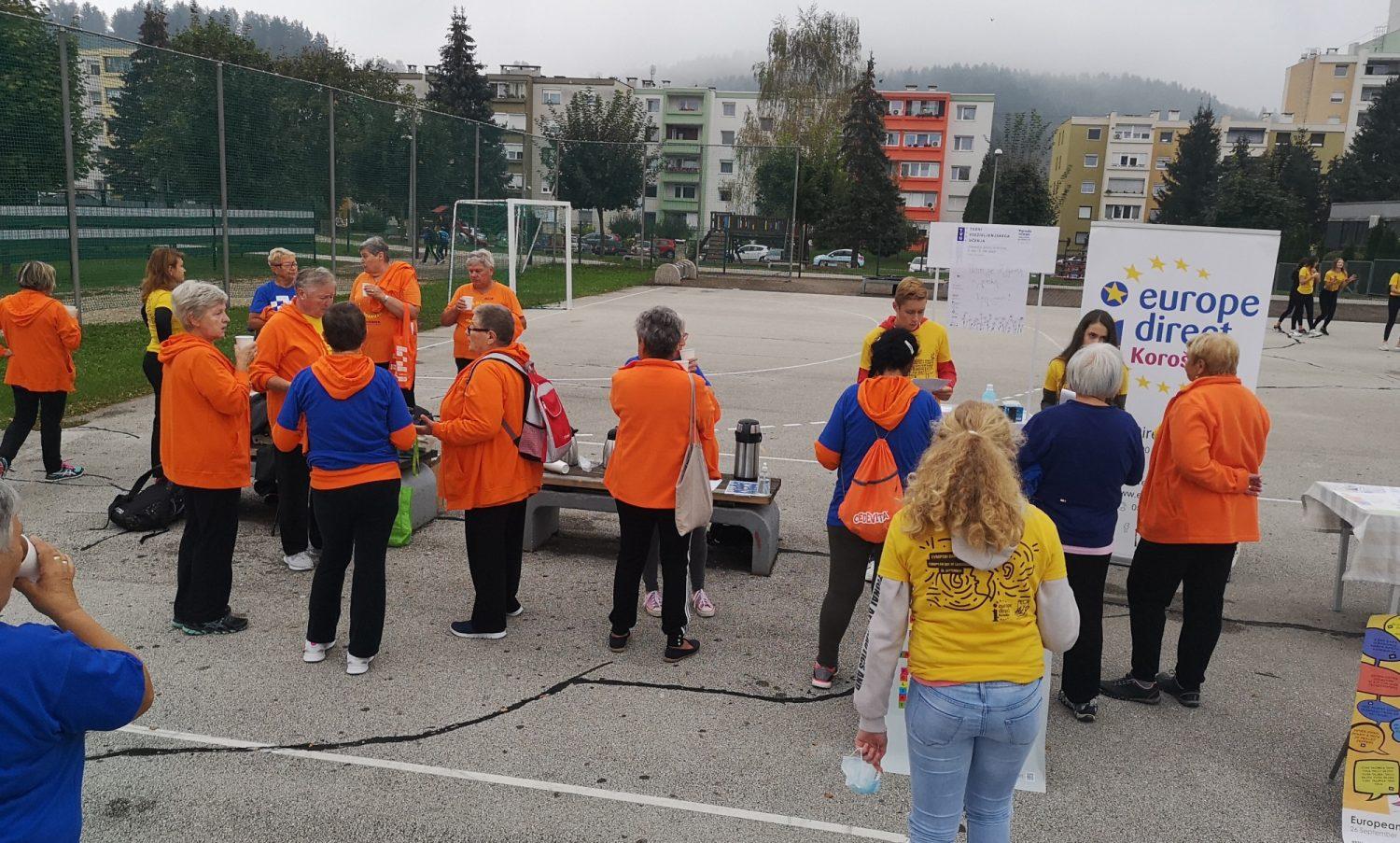 Članice Šole zdravja Javornik in devetošolci javorniške osnovne šole so se že pred pol osmo zjutraj zbrali na igrišču na Javorniku, kjer je potekala živahna športno-jezikovna akcija, ki jo je Europe Direct Koroška tudi v živo prenašala na svojem Facebook profilu. Skupno so telovadili na svežem zraku, seveda ob varni razdalji, snemali intervjuje in izjave, predstavili so različne oblike rekreacije ter pomen učenja tujih jezikov, pripravili so intenziven hitri tečaj angleščine za članice Šole zdravja s strani osnovnošolcev, za zaključek pa so se poslovili v uradnih jezikih Evropske unije.