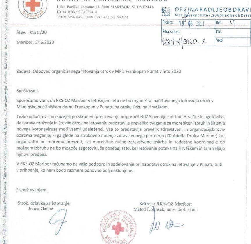 Zapisal je: "S strani OZRK Radlje smo prejeli obvestilo, da jih je RKS OZ Maribor obvestil, da ob upoštevanju navodil za preprečevanje širjenja okužbe s COVID-19 in nepredvidljivega razvoja dogodkov v