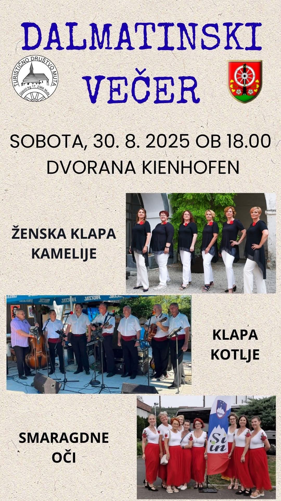 Ob 18. uri pa se bo dogajanje preselilo v dvorano Kienhofen, kjer bo potekal Dalmatinski večer. Občinstvo bodo navdušile: ženska klapa Kamelije, klapa Kotlje in plesalke skupine Smaragdne oči. Izjemna priložnost na večer dobre glasbe z mediteranskim pridihom, ki poletje kliče nazaj.