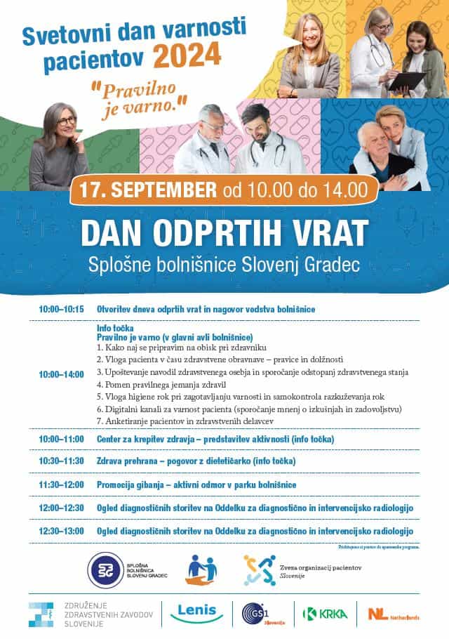 Splošna bolnišnica Slovenj Gradec vabi v okviru aktivnosti ob Svetovnem dnevu varnosti pacientov, na dan odprtih vrat, 17. septembra 2024 od 10.00 do 14.00 ure.