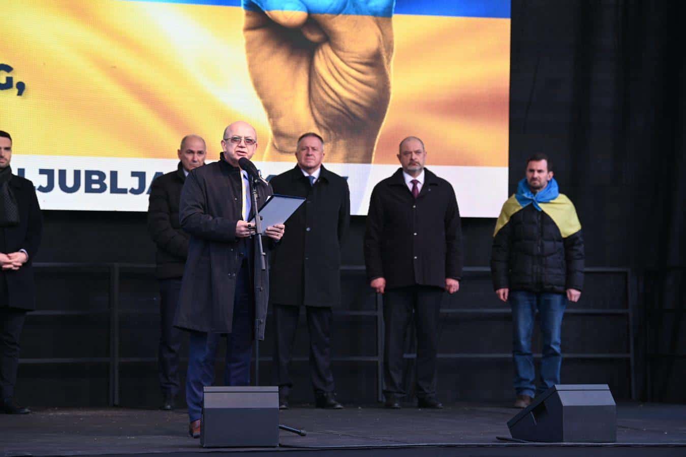 Ukrajinski veleposlanik v Ljubljani Mihajlo Brodovič je na shodu opozoril na grozote vojne, ki že teden dni poteka v Ukrajini in v kateri je bilo ubitih že več kot 2000 civilistov. Poudaril je, da se usoda Evrope trenutno odloča v Ukrajini, in se svetu ter Sloveniji zahvalil za podporo.