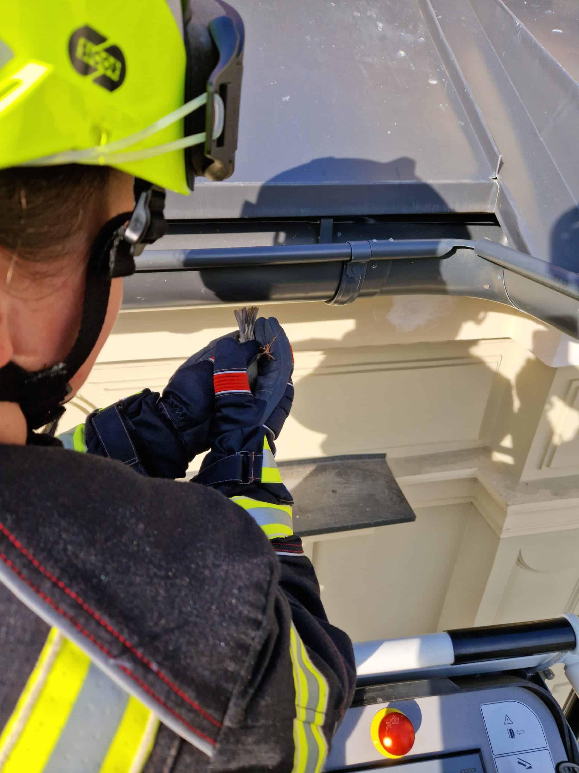 V centru mesta so iz žleba strehe rešili ujeto ptico. Bil je vrabček, izpuščen nazaj v naravno okolje.