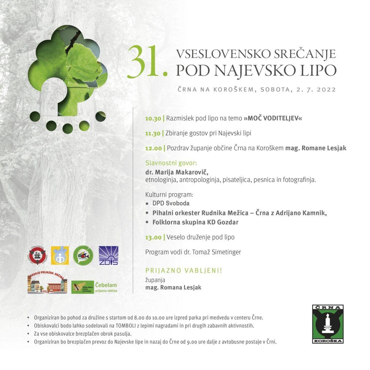 Pogovor v okviru razmisleka pod lipo se bo začel ob 10.30, samo srečanje pa ob 12. uri. Na njem bo slavnostna govornica etnologinja in antropologinja Marija Makarovič, raziskovalka Črne in avtorica več knjig ter v preteklosti prejemnica nagrade občine za prispevek k prepoznavnosti Črne.