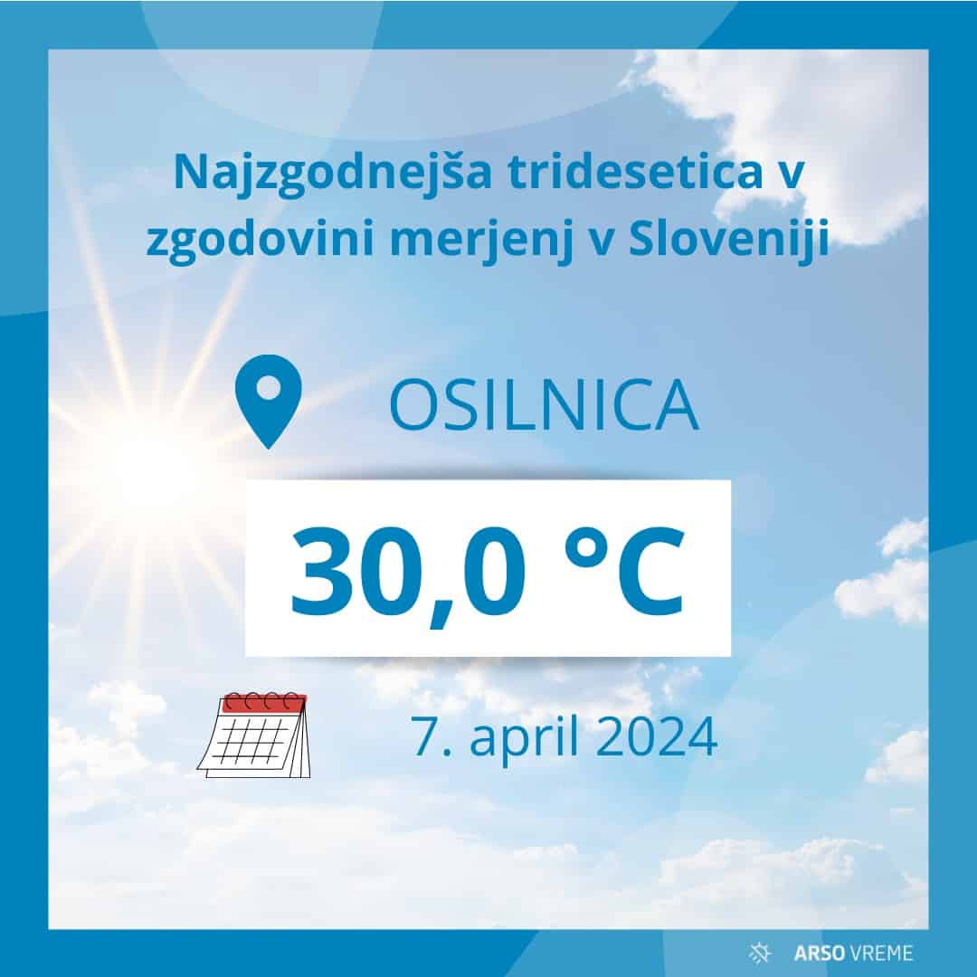 "Izmerili smo prvo tridesetico v letošnjem koledarskem letu. 30,0 °C je bilo doseženih v Osilnici. Danes je bilo doseženih še nekaj drugih aprilskih rekordov, o katerih bomo poročali v naslednjih objavah," so zapisali na družabnem omrežju Facebooka.