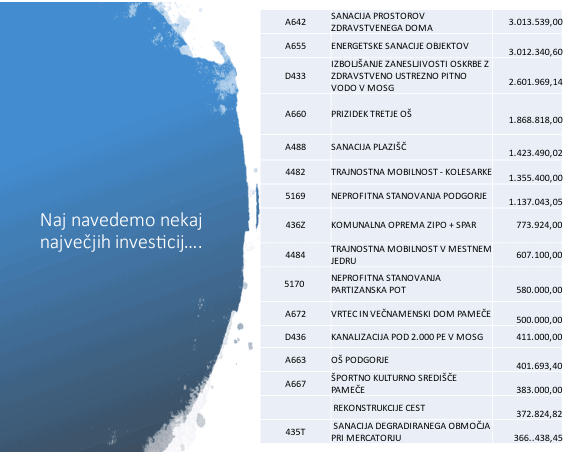 Med odhodki pa izstopajo investicijski odhodki in transferi, ki znašajo 24.968.772,06 evrov oziroma kar 60,3 odstotkov vseh odhodkov. Razlog za tako visoka investicijska vlaganja leži v zaključku velikih investicij, sofinanciranih s strani EU. Medtem ko so že zaključene investicija Izgradnja bloka neprofitnih stanovanj v MČ Polje, Podjetniška cona Pameče 3 in izgradnja bazena ter parka urbanih športov, pa bodo v letu 2023 zaključili še izgradnjo Ultrafiltracije (izboljšanje zanesljivosti oskrbe z zdravstveno ustrezno pitno vodo v MOSG), kolesarskih stez in obnovo ulic v mestnem jedru. Poleg tega gradijo prizidka k Tretji OŠ in OŠ Podgorje, pričenjajo z javno zasebnim partnerstvom na področju energetske sanacije stavbe na Gosposvetski 4, Zdravstvenega doma Slovenj Gradec in Športne hale Slovenj Gradec, izvajajo pa tudi številne druge investicije, ki so razvidne iz spodnje tabele.