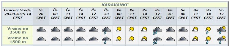 Danes bo zjutraj delno jasno z nekaj srednje in visoke oblačnosti. Pozneje se bodo razvili kopasti oblaki in popoldne ali zvečer bodo nastale posamezne plohe in krajevne nevihte. Pihal bo šibak veter južnih smeri. Najvišje dnevne temperature bodo od 26 do 32 °C. Temperatura na 1500 m bo okoli 18, na 2500 m pa okoli 11 °C.