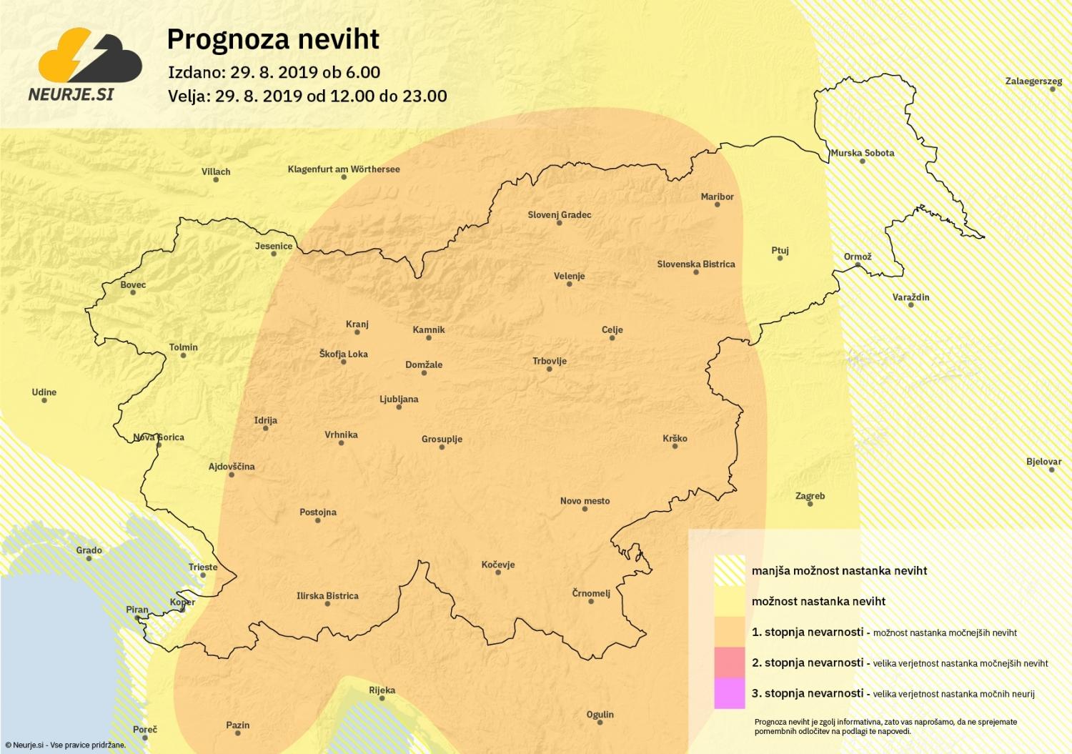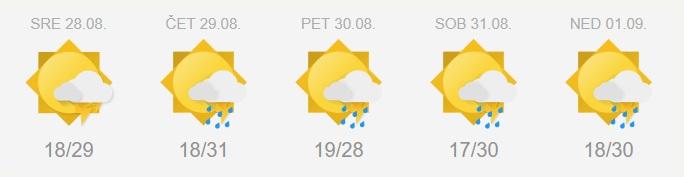 Danes bo sprva spremenljivo, tudi pretežno oblačno, čez dan pa delno jasno z občasno povečano oblačnostjo. Najvišje dnevne temperature bodo okoli 30 °C. V drugi polovici dneva, predvsem popoldan in proti večeru, bodo ponekod po Sloveniji nastajale lokalne plohe in predvsem nevihte.