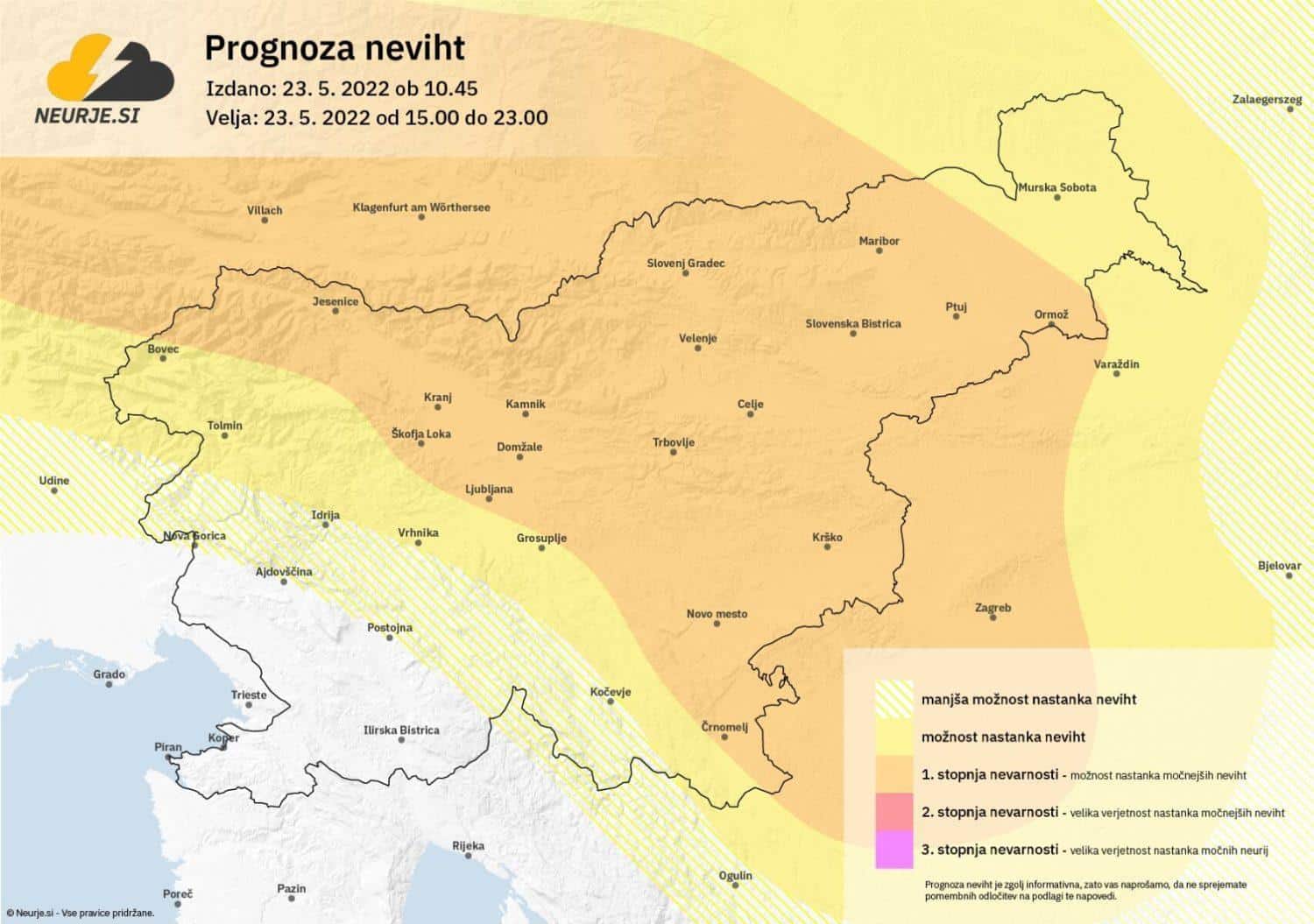 Nad našimi kraji se bo danes popoldne zadrževala večja zaloga razpoložljive potencialne konvektivne energije (do 2000 J/kg). V kombinaciji z ugodnim vetrovnim profilom bodo ob morebitnem proženju nevihtnih celic lokalno lahko nastala krajevna neurja z močnim vetrom, nalivi in točo. Močne nevihte bodo najbolj verjetne na Koroškem, Štajerskem, Gorenjskem ali v osrednji Sloveniji.