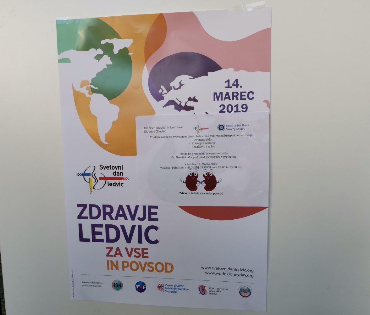 Danes, 14. 3. 2019, obeležujemo svetovni dan ledvic, ki je namenjen ozaveščanju o vse večjih obremenitvah, ki jih povzroča kronična ledvična bolezen. Pri tem gre tako za socialne stiske bolnikov kot tudi naraščanje stroškov za zdravljenje te bolezni. Najbolj učinkovit način zmanjševanja negativnih posledic je preprečevanje in zgodnje odkrivanje kronične ledvične bolezni. V ta namen danes tudi na Koroškem brezplačno merijo krvni tlak in testirajo beljakovine v seču, ki so zgodnji znak ledvične bolezni. Mi smo obiskali SB Slovenj Gradec, kjer je preventivna akcija v polnem teku.