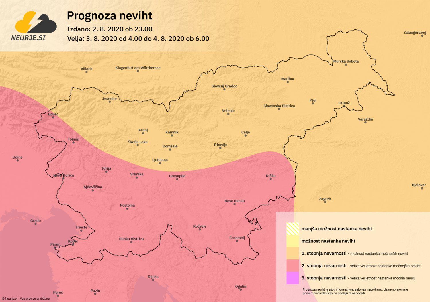 Nad severno Italijo bodo tekom noči že nastajale posamezne, tudi močnejše, nevihte, ki se bodo pomikale proti zahodni Sloveniji in Obali. V jutranjih urah tam pričakujemo prvi pas neviht, ki bodo nato proti notranjosti države slabele. Tekom dneva se bo predvsem na vzhodu države lahko za krajši čas delno zjasnilo, zlasti na zahodu in jugu pa bodo že nastajale nove plohe in nevihte, ki bodo potovale proti severovzhodu. Ob nevihtah so možni lokalno močnejši in dolgotrajnejši nalivi, sunki nevihtnega piša in toča. Po nastanku se bodo nevihte združevale v večje nevihtne sisteme ali linije, sprva pa so lahko tudi izolirane (verjetnost debelejše toče). Nevihte bodo imele za razvoj in krepitev na zahodu in jugu države na voljo med 1500 in 2500 J/kg konvektivne potencialne energije (nad severnim Jadranom lahko tudi več), ki bo sovpadala z zmernim do izrazitim vetrovnim striženjem (do 20 m/s v vertikalni plasti 0-6 km). Vetrovni profil bo nad ravnino severne Italije ugoden za nastanek superceličnih neviht, ki niso izključene tudi pri nas na jugu in deloma vzhodu države. Nov pas neviht bo iz smeri severne Italije in severnega Jadrana zahod države dosegel zvečer oz. v noči na torek. Možen je razvoj nevihtne linije, ki bo dosegla Obalo, hrvaško Istro in Kvarner ter potovala v notranjost Slovenije in Hrvaške. Ob prihodu nevihtne linije bodo glavno nevarnost povzročali močni sunki zahodnega vetra in močni nalivi. Proženje ploh in neviht s krajšimi prekinitvami se bo nadaljevalo tudi ponoči in v torek čez dan.