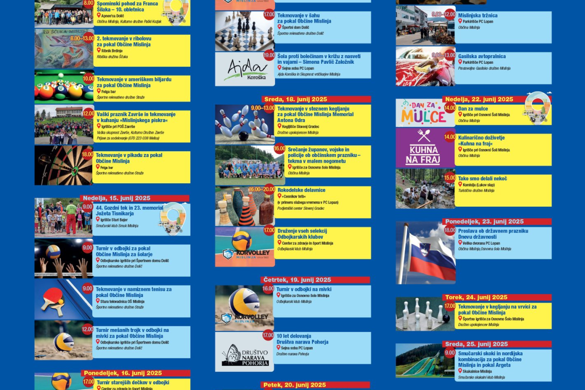 - Turnir v odbojki za pokal Občine Mislinja za šolarje, prav tako s pričetkom ob 9.00 uri na odbojkarskem igrišču pri Športnem domu Dolič