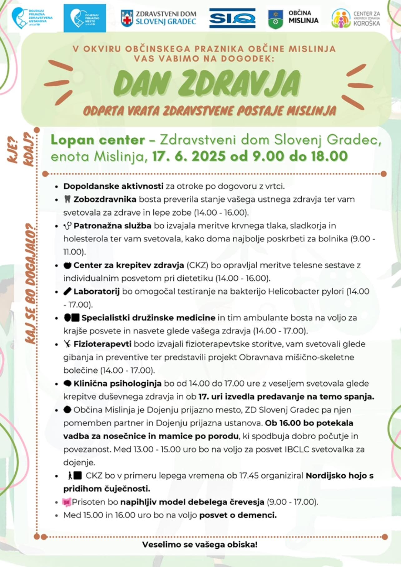 - Dan zdravja v Mislinji bo potekal dopoldne od 9.00 do 11.00 ure ter popoldne od 14.00 do 18.00 ure v PC Lopan