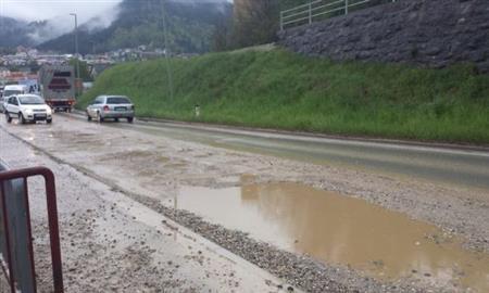 V naselju Meža na glavni cesti zadnji mesec občasno potekajo gradbena dela z namenom izgradnje vodovodnega omrežja. Med samim delom je promet urejen s semaforjem, trenutno pa je vozni pas, kjer potekajo dela, zasut s peskom. Ob močnem dežju v noči na petek so v makadamu nastale luknje, po nekaterih ocenah globoke tudi do 40cm, zaradi katerih je postala vožnja po voznem pasu nemogoča in so se vozniki umikali na nasprotni vozni pas. Ker ni bilo semaforja ali drugega načina, ki bi omogočal varno izmenično vožnjo po enem voznem pasu, so morali posredovati policisti, ki so usmerjali promet, kasneje pa je bil postavljen tudi semafor.