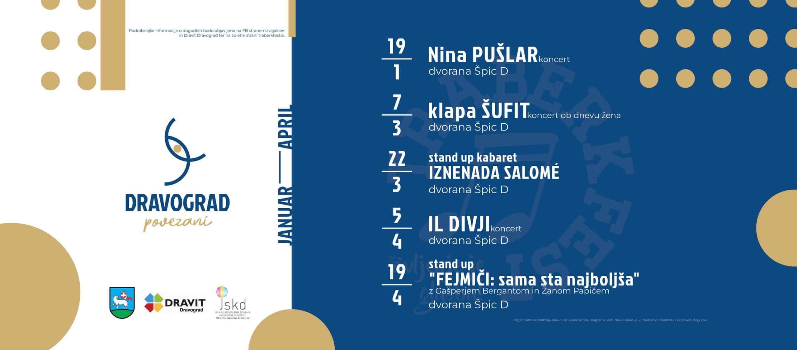 Na novinarski konferenci pa so naznanili tudi prvih pet večjih dogodkov, ki se bodo od januarja do aprila zgodili v sklopu TraberkFesta. 19. januarja 2024, bo v razprodani dvorani Špic D nastopila Nina Pušlar, 7. marca 2024 ob Dnevu žena - prihaja v Dravograd klapa Šufit, 22. marca 2024, si boste lahko ogledali standup kabaret Iznenada Salome, 5. aprila 2024 prihajajo IL DIVJI in 19. aprila 2024 standup "FEJMIČI sama sta najboljša".