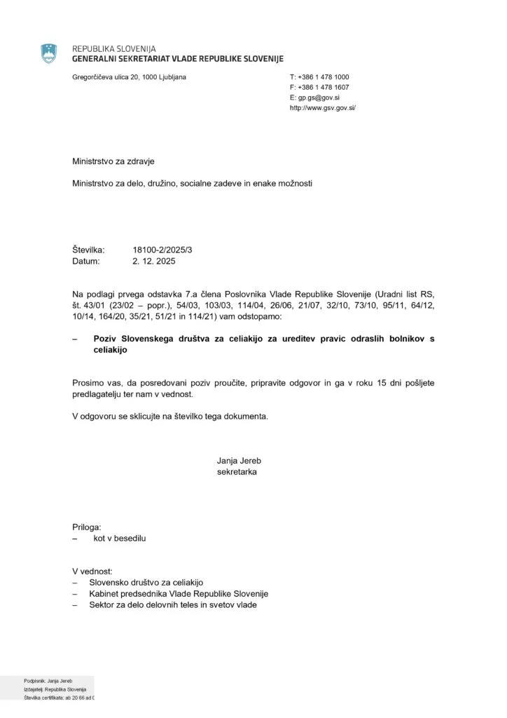 Generalni sekretariat Vlade Republike Slovenije je na podlagi prejete dokumentacije pozval Ministrstvo za zdravje ter Ministrstvo za delo, družino, socialne zadeve in enake možnosti, naj preučita posredovani poziv Slovenskega društva za celiakijo in pripravita odgovor v roku 15 dni. Oba resorja sta tako pozvana, da se do predlaganih rešitev ter odprtih vprašanj glede pravic odraslih bolnikov s celiakijo uradno opredelita.