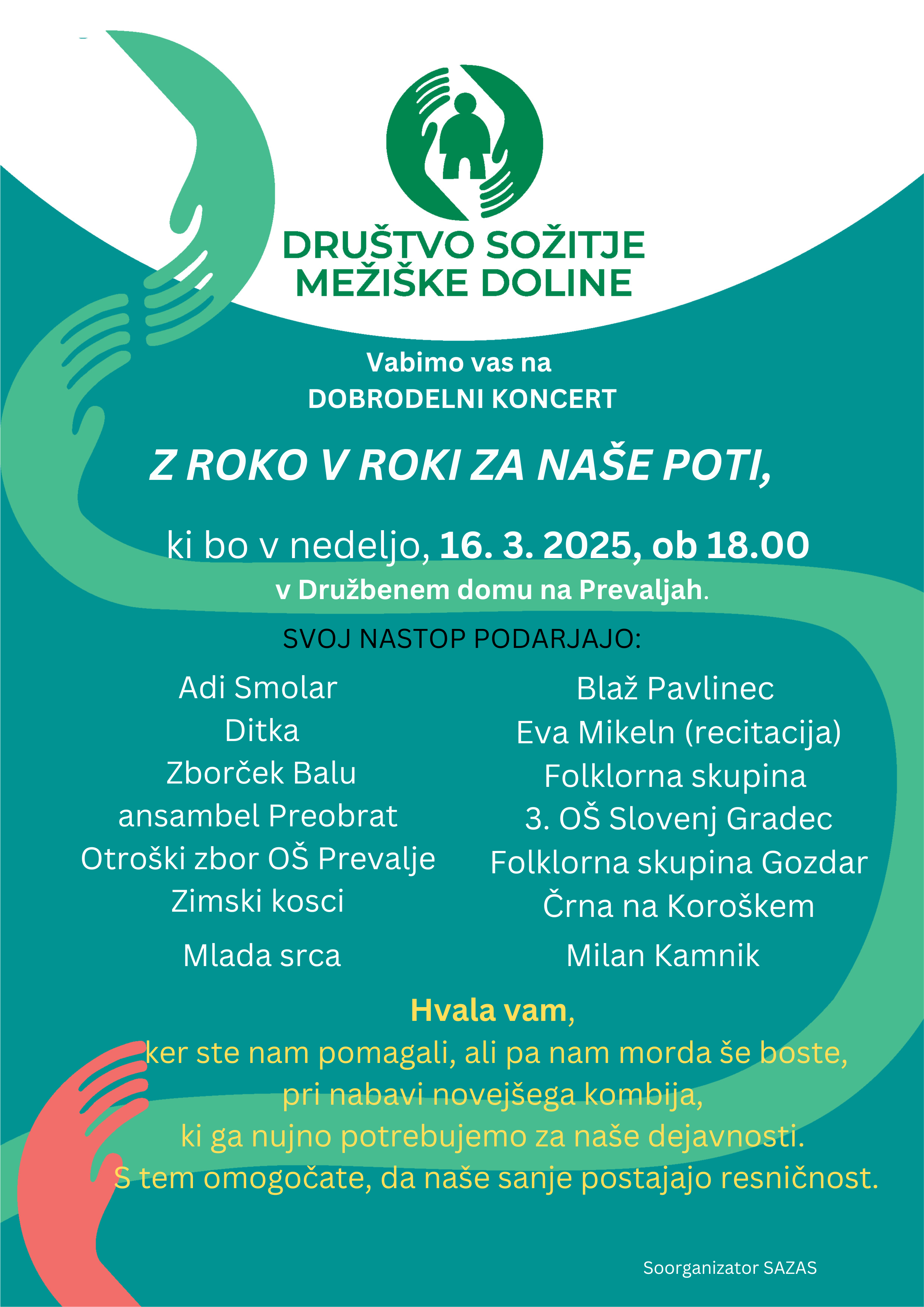 Koncert, ki nosi naslov ''Z roko v roki za naše poti'', bo na odru združil kopico koroških glasbenikov in drugih nastopajočih, ki bodo vsak s svojim prispevkom pričarali čudovit, dobrodelnosti poln večer.