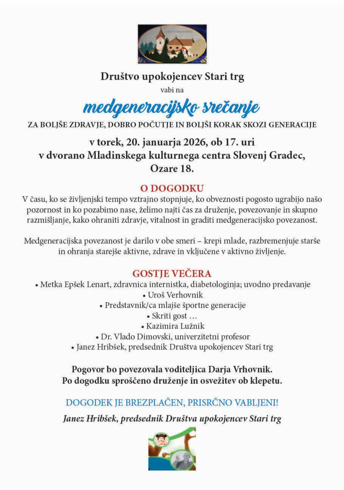 Za boljše zdravje, dobro počutje in boljši korak skozi generacije, vabi Društvo upokojencev Stari trg vse občanke in občane na medgeneracijsko srečanje, ki bo potekalo v dvorani Mladinskega kulturnega centra Slovenj Gradec v torek, 20. januarja 2026, ob 17. uri.