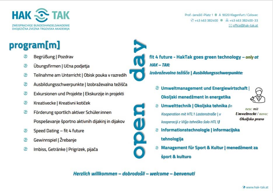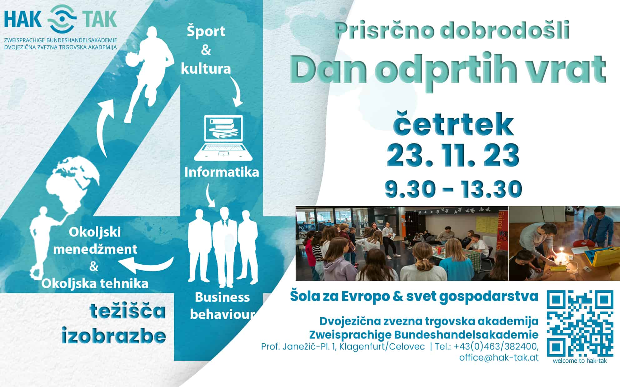 V kolikor bi vas zanimalo nadaljevanje šolanja v Celovcu na Dvojezični trgovski akademiji, se jim pridružite v četrtek, 23. novembra 2023, ko bodo na široko odprli svoja vrata novim, nadobudnim dijakom, ki korakajo proti srednješolskemu izobraževanju.