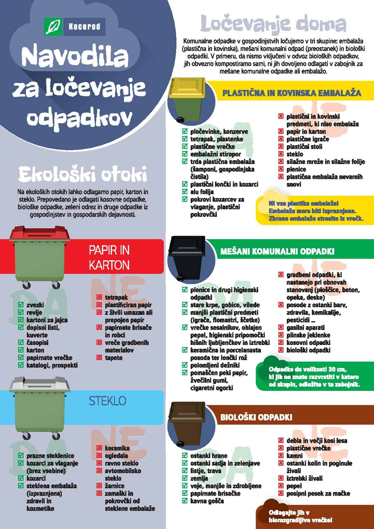 Na ekološkem otoku so nameščene kante za papir in steklo, zabojnik za električno in elektronsko opremo, zbiralnik za odpadno olje in zbiralnik rabljenih oblačil, kamor se odpadki odlagajo v zato pripravljene reže in odprtine. Vsi ostali gospodinjski odpadki se sortirajo med mešane komunalne odpadke (črne kanta), embalažo (zelena kanta) in biološke odpadke (rjava kanta ali kompost). Vse ostale odpadke, ki jih ni mogoče uvrstiti v navedene kante se lahko BREZBPLAČNO oddajo v zbirnem centru na Muti. ko-cerod.si/locevanje-odpadkov/zbirni-centri/