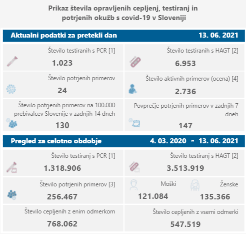 Število opravljenih testiranj in število potrjenih okužb s covidom-19 do vključno 13. 6. 2021: