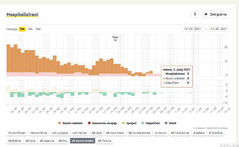 Po zadnjih podatkih Covid-19 sledilnika v Splošni bolnišnici Slovenj Gradec ne zdravijo nobenega covidnega pacienta. Nazadnje so imeli hospitaliziranega bolnika s potrjeno okužbo v soboto, 5. junija 2021.