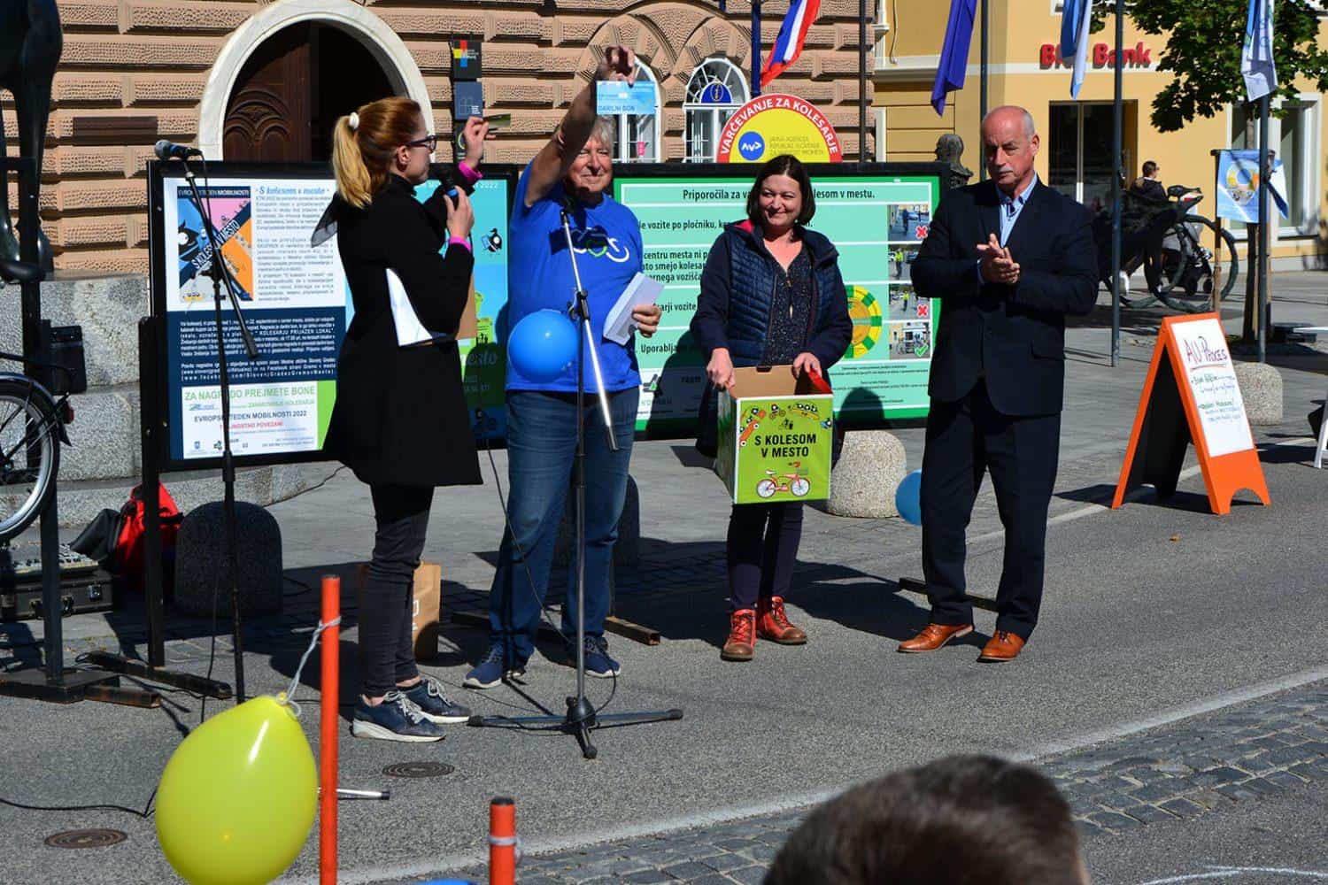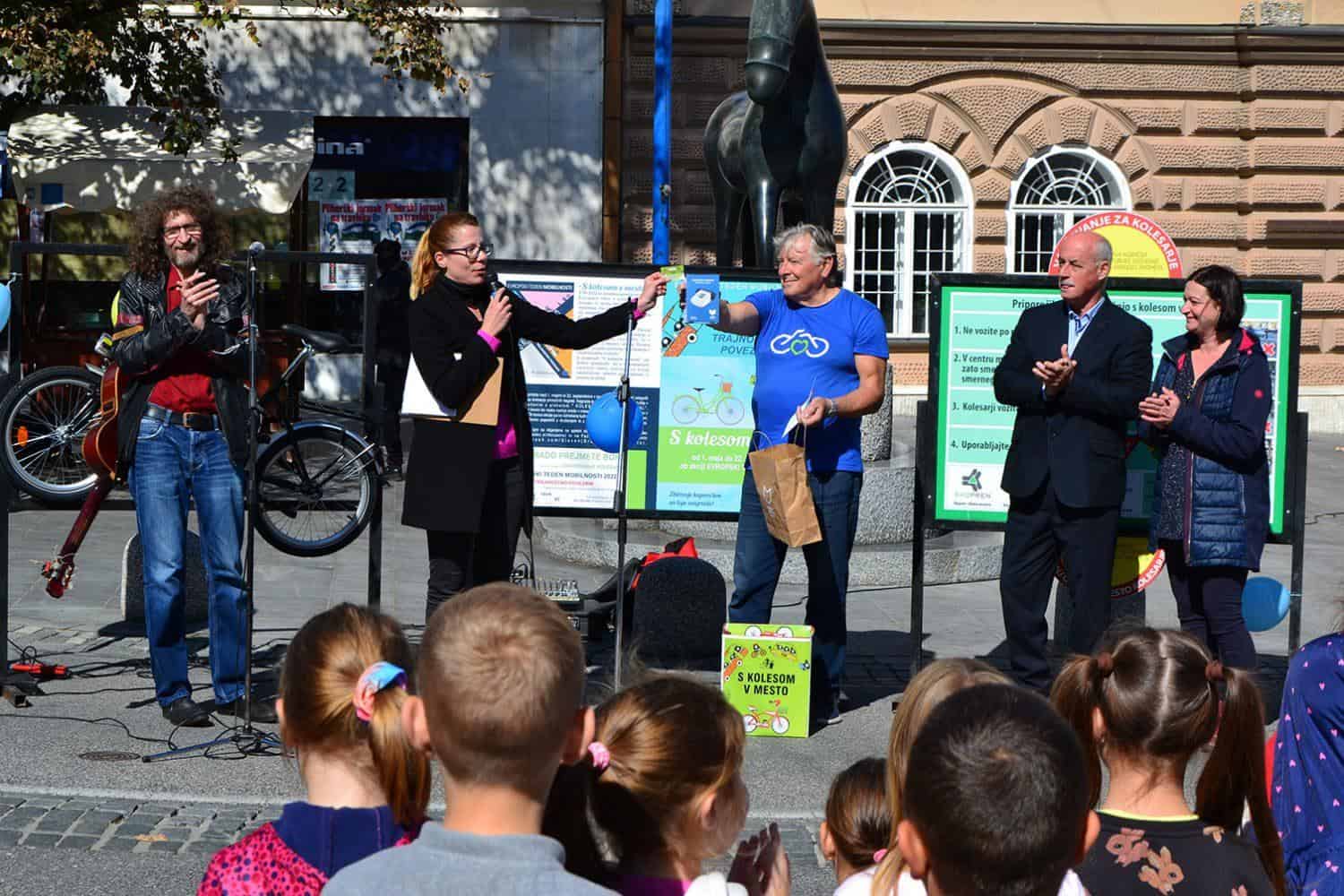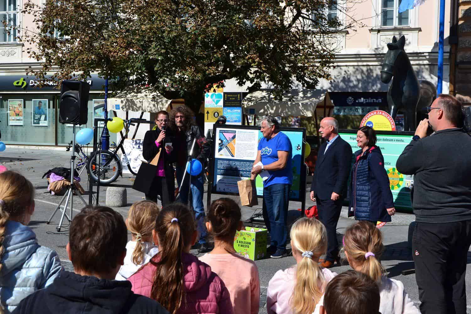 Ob 11.00 je epilog doživel projekt "S kolesom v mesto", ki na trajnostni način življenja opozarja že skoraj desetletje in v sklopu katerega je podžupan Mestne občine Slovenj Gradec gospod Peter Pungartnik podelil glavno nagrado.