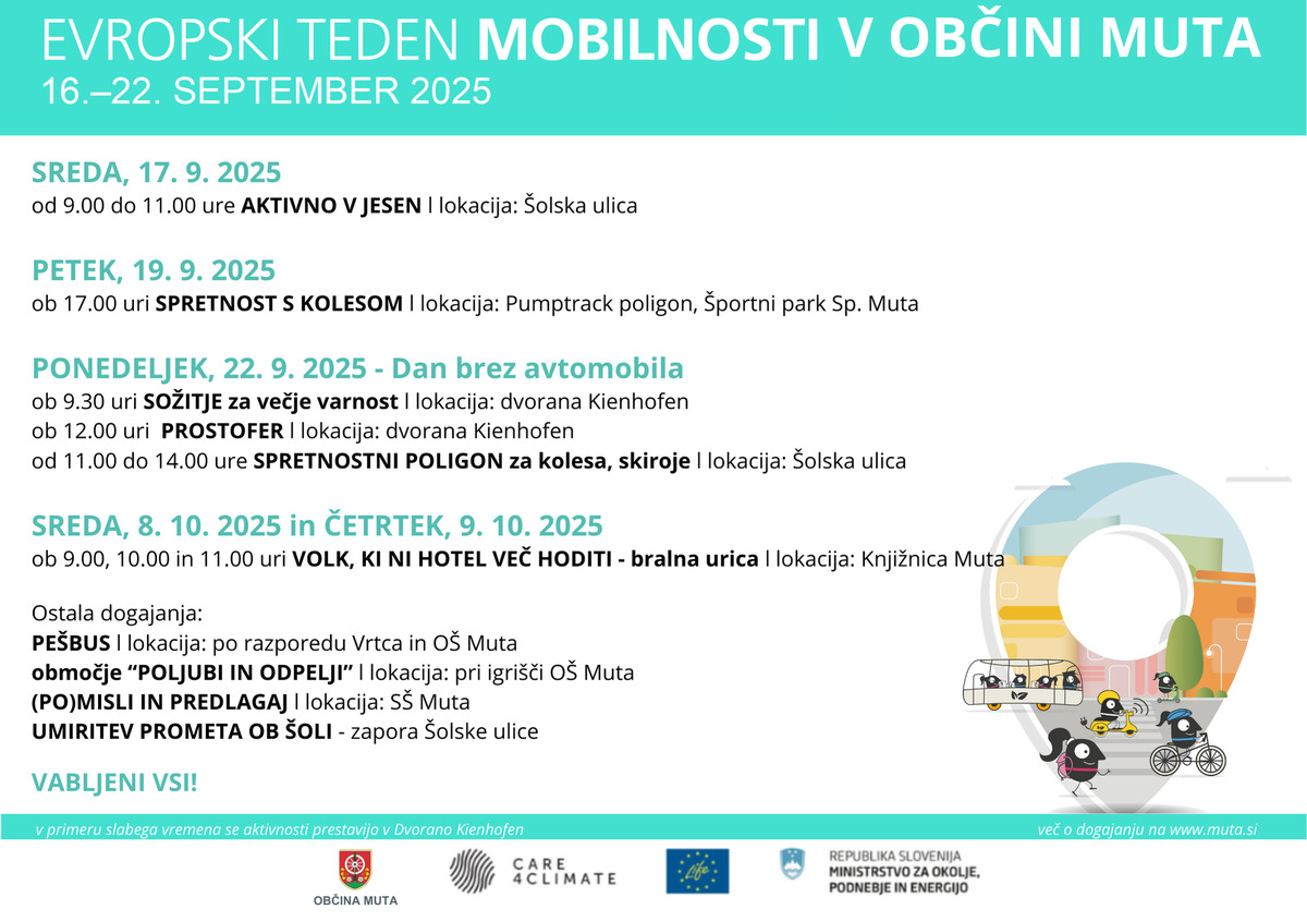 O posameznih dogodkih bodo sproti obveščali na spletni strani Občine Muta. Več o Evropskem tednu mobilnosti boste našli na tej povezavi.