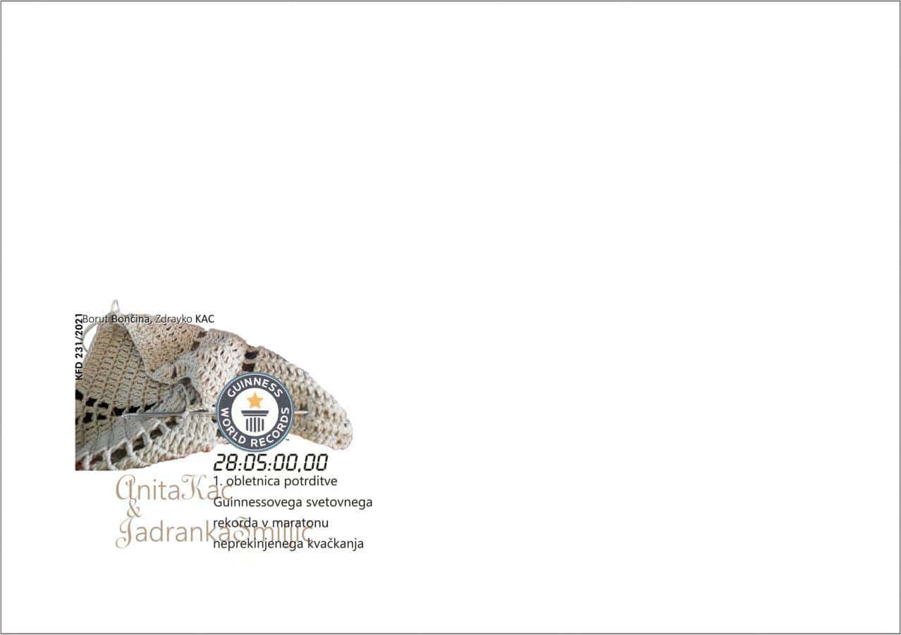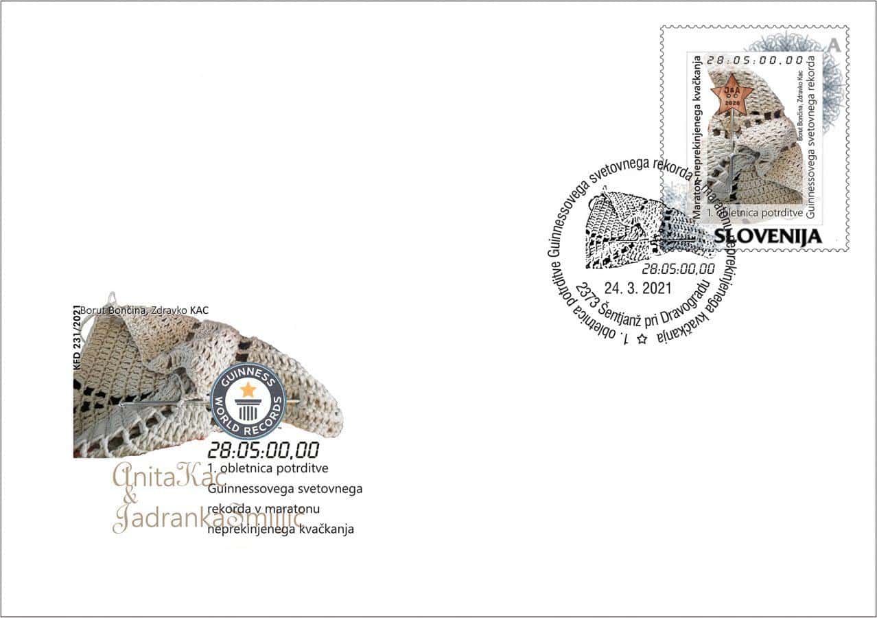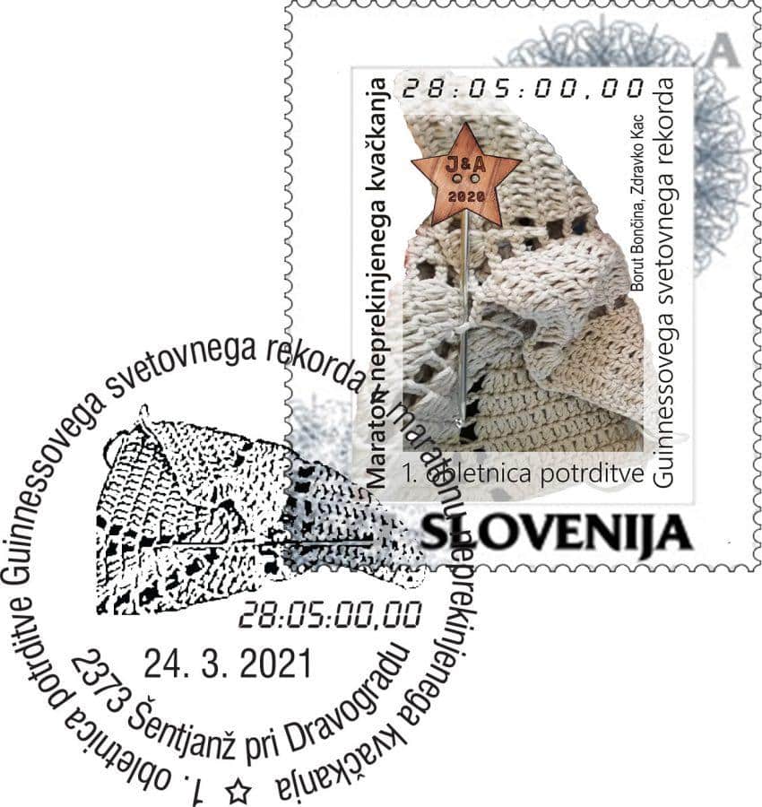 Borut Bončina, Peter Močnik in Jože Keber so v sodelovanju s Koroškim filatelističnim društvom in ob podpori Zdravka Kaca in skupine J&A2020 v počastitev 1. obletnice potrditve Guinnessovega svetovnega rekorda v maratonu neprekinjenega kvačkanja, pripravili priložnostni poštni žig, poštno ovojnico in osebno poštno znamko, ki bodo v sredo, 24. marca 2021 v uporabo na pošti 2373 Šentjanž pri Dravogradu. V prostorih pošte bodo pripravili tudi filatelistično razstavo.