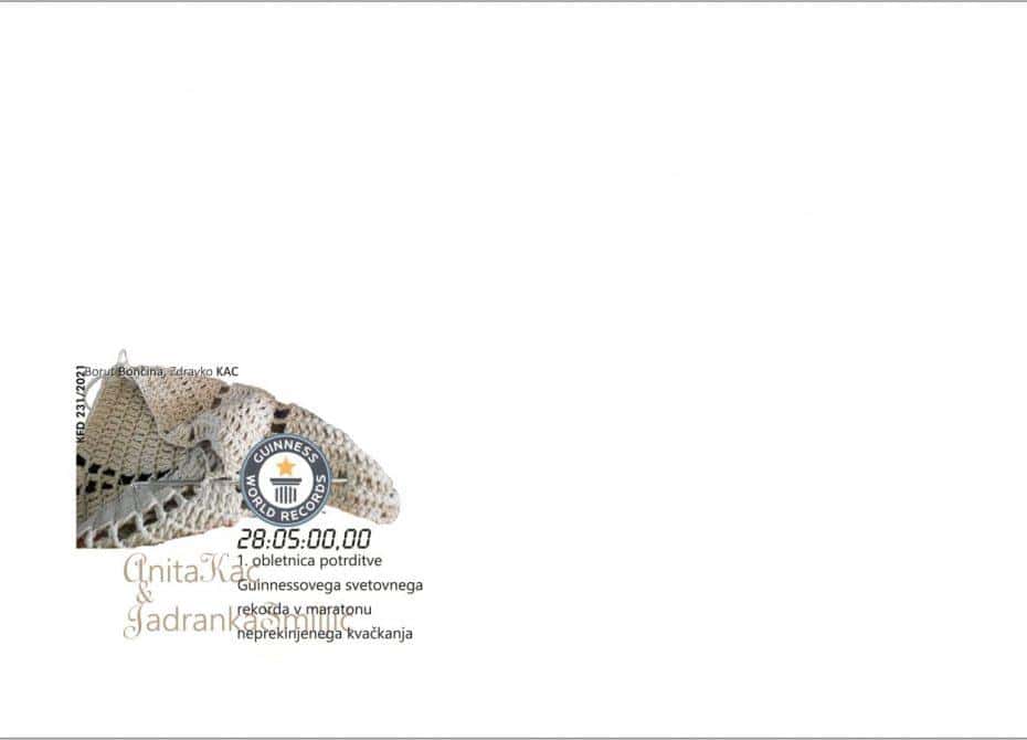 FOTO: Filatelistični poklon v počastitev 1. obletnice potrditve Guinnessovega svetovnega rekorda v maratonu neprekinjenega kvačkanja