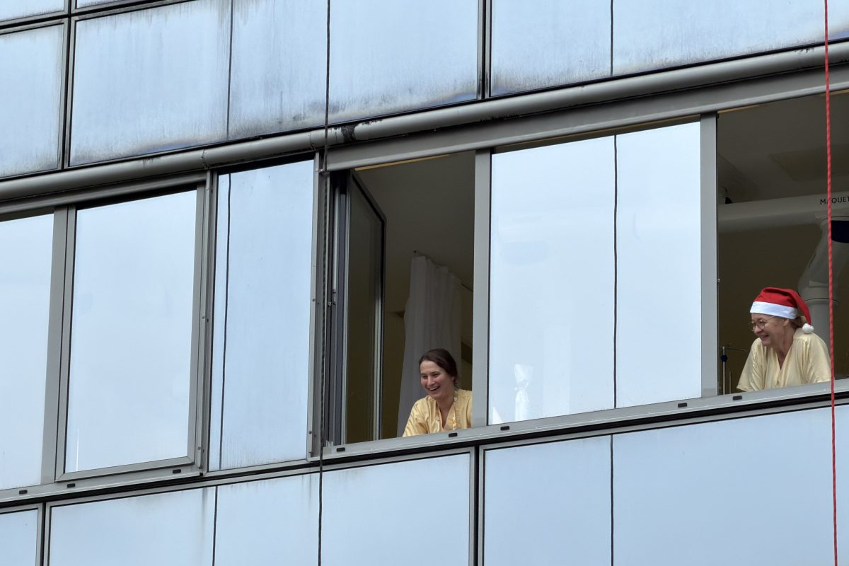 Pred bolnišnico se je zbralo lepo število gledalcev, ki so z navdušenjem opazovali pogumne Božičke pri njihovem veličastnem prihodu. Ti so med otroke razdelili bonbone in tople besede.