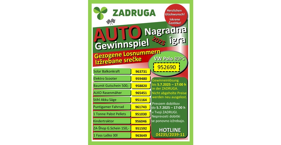 Če je bila izžrebana prav vaša srečka (številka), se najkasneje do 5. julija oglasite v Zadrugi ali jih pokličite na 04235/2039-11. Petega julija ob 17. uri bo potekala tudi podelitev nagrad. Za nagrade, ki ne bodo prevzete, bodo ta dan žreb ponovili, zato srečko hranite, tudi če se vam sreča tokrat ni nasmehnila.