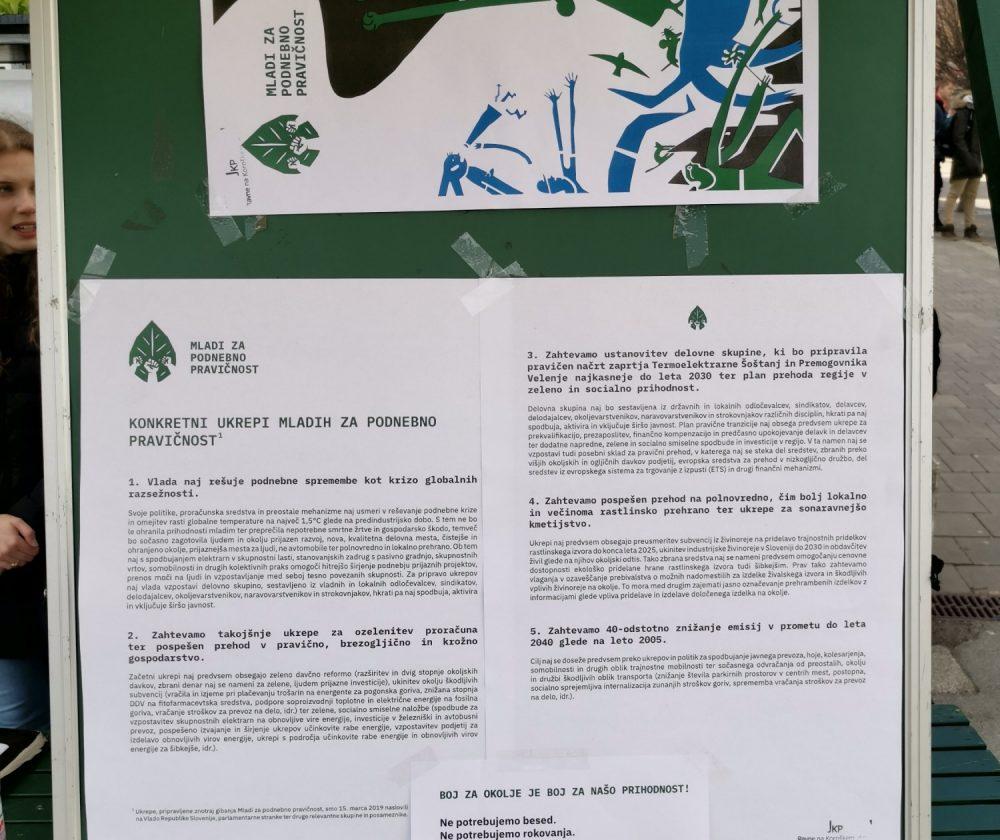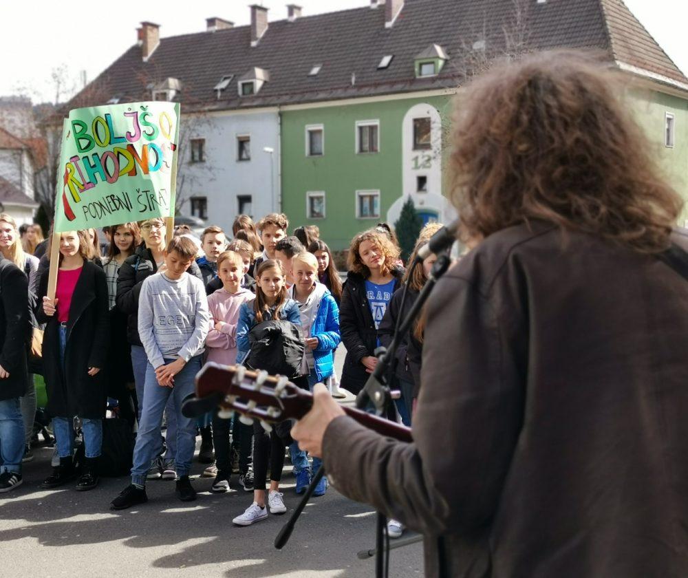 "Okoljska problematika se nikoli ne konča na državnih mejah, zato je prav, da ste se mladi v več kot 100 državah sveta od Avstralije do Kolumbije združili v zahtevah po podnebni pravičnosti in postavili konkretne zahteve po omejitvi globalnega segrevanja, zelenih delovnih mestih, polnovredni lokalno pridelani hrani," je nagovor sklenil mentor dijaške skupnosti Gimnazije Ravne.