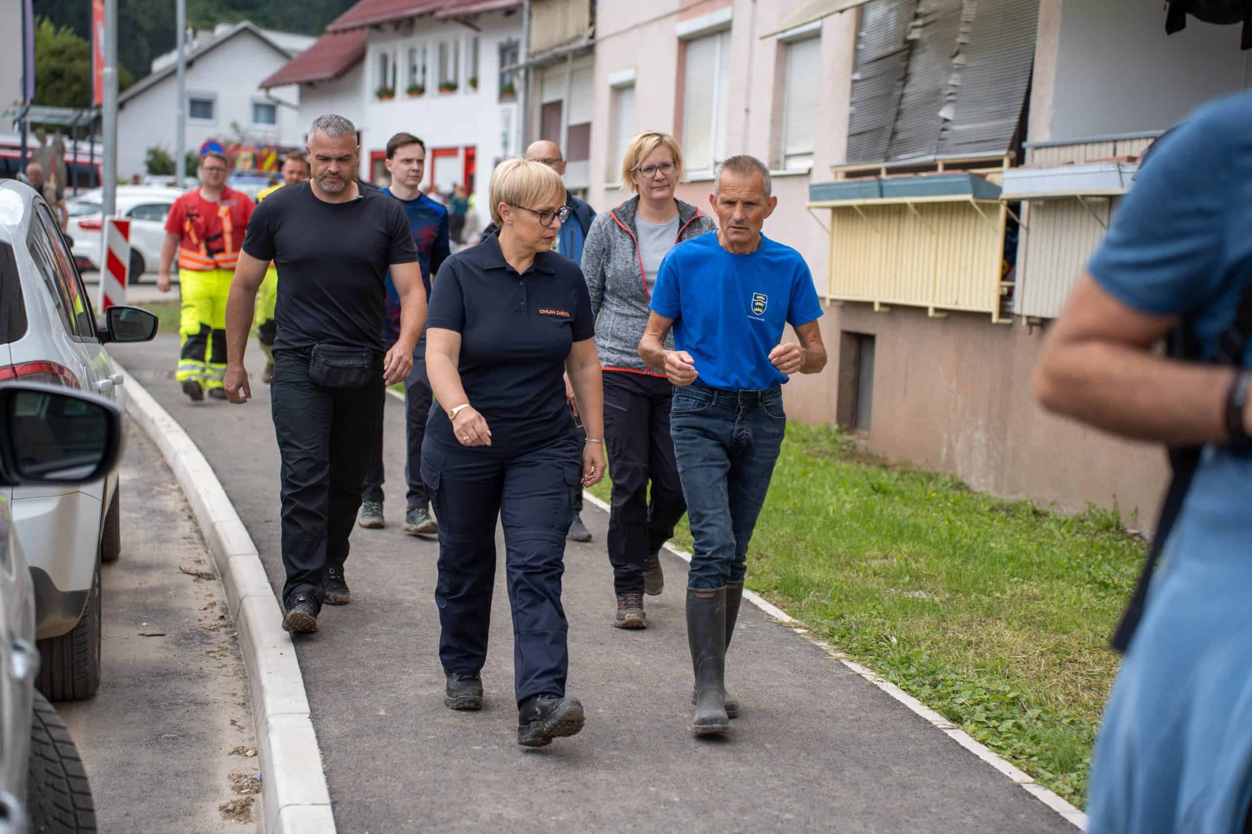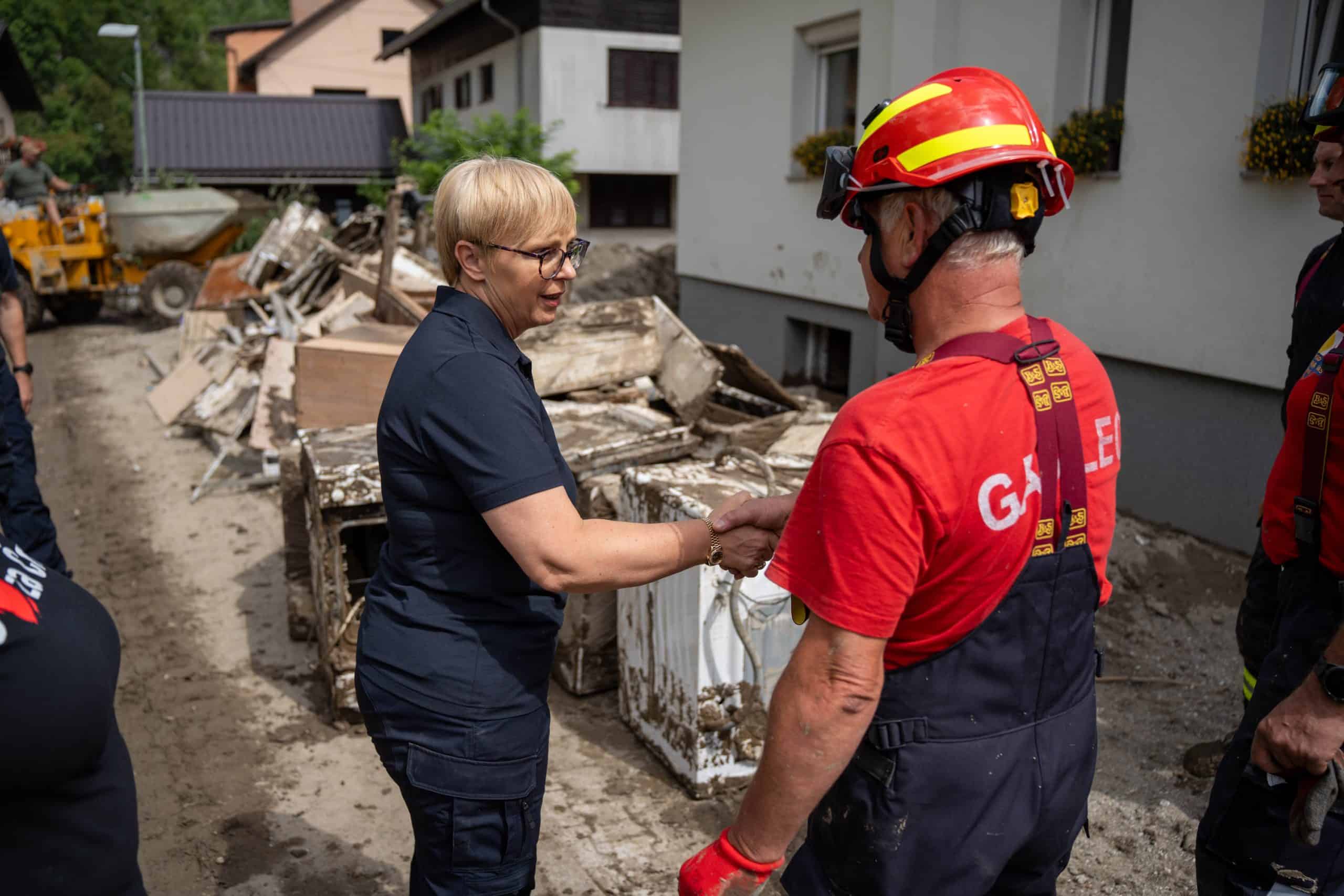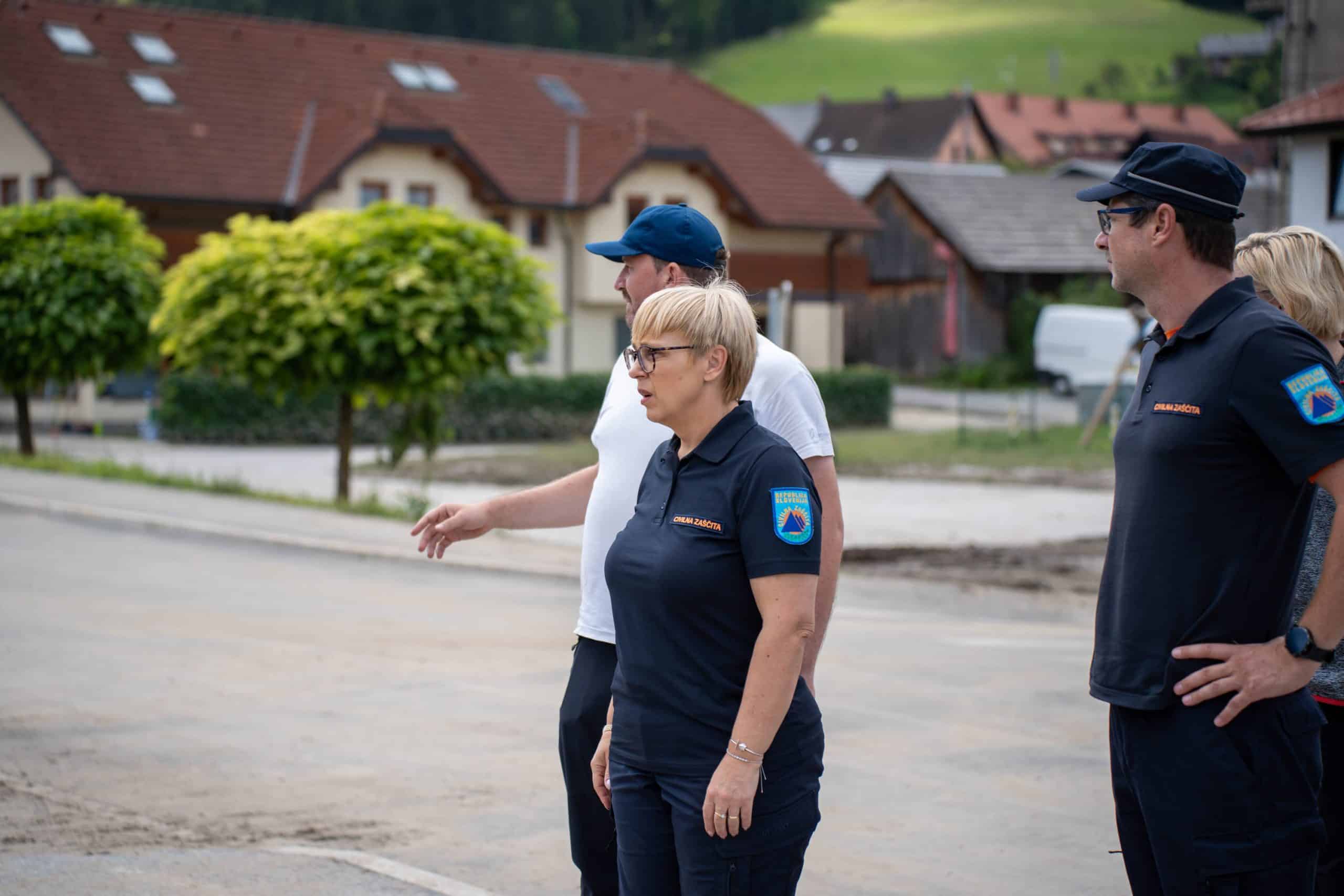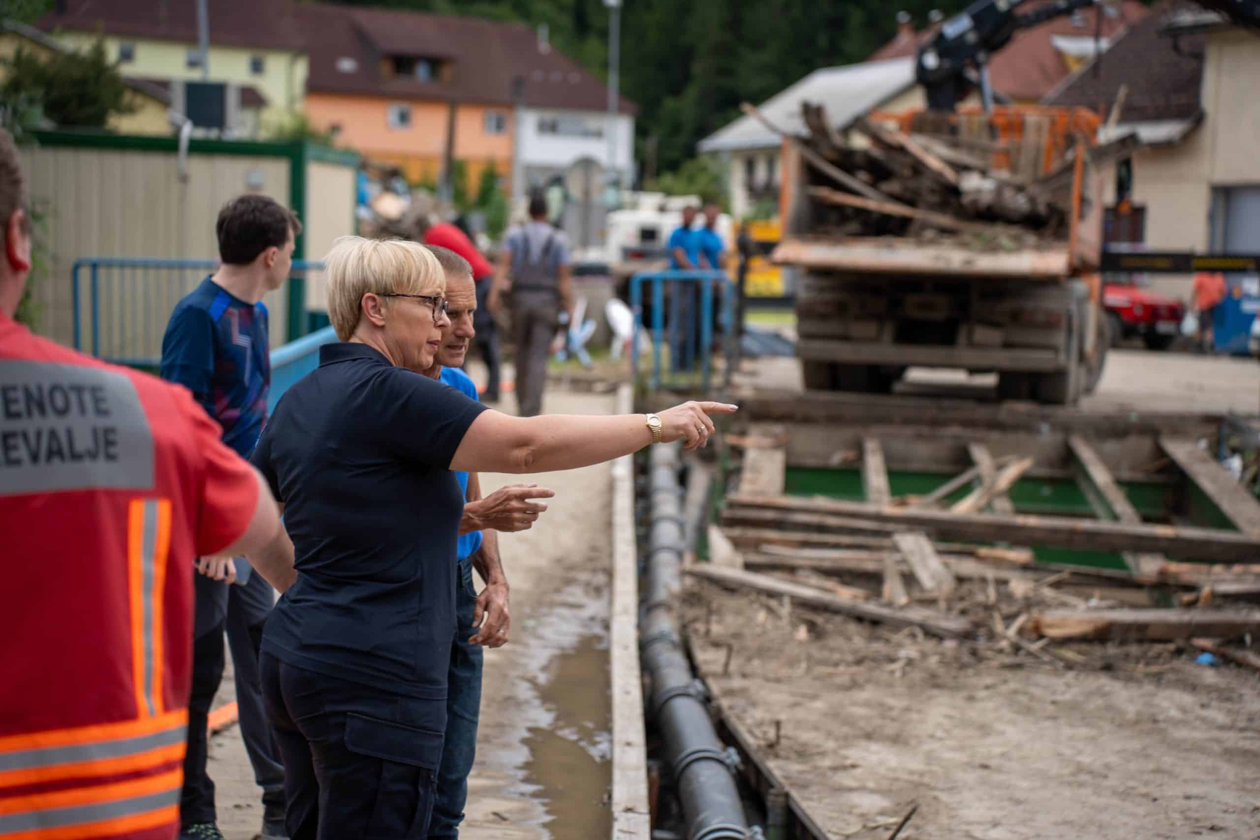 Na Ravnah na Koroškem se je srečala s prebivalkami in prebivalci, predstavniki lokalnih skupnosti, Civilne zaščite in gasilci in si ogledala posledice hudih poplav, ki so močno prizadele našo regijo. V spremstvu župana dr. Tomaža Rožena, podžupana Petra Stočka, poveljnika Branka Kakerja, dela CZ Štaba Občine Ravne je pozdravila tudi mnoge prostovoljce in si ogledala stanje.