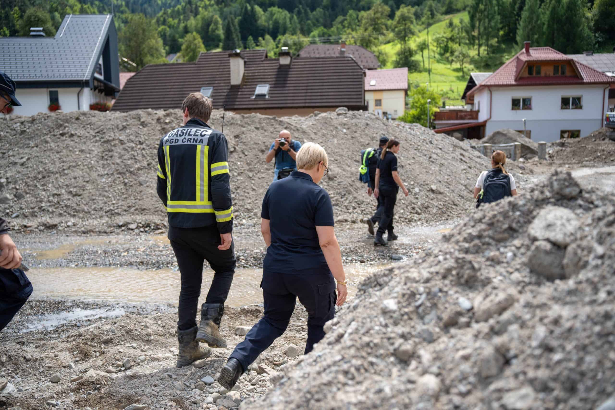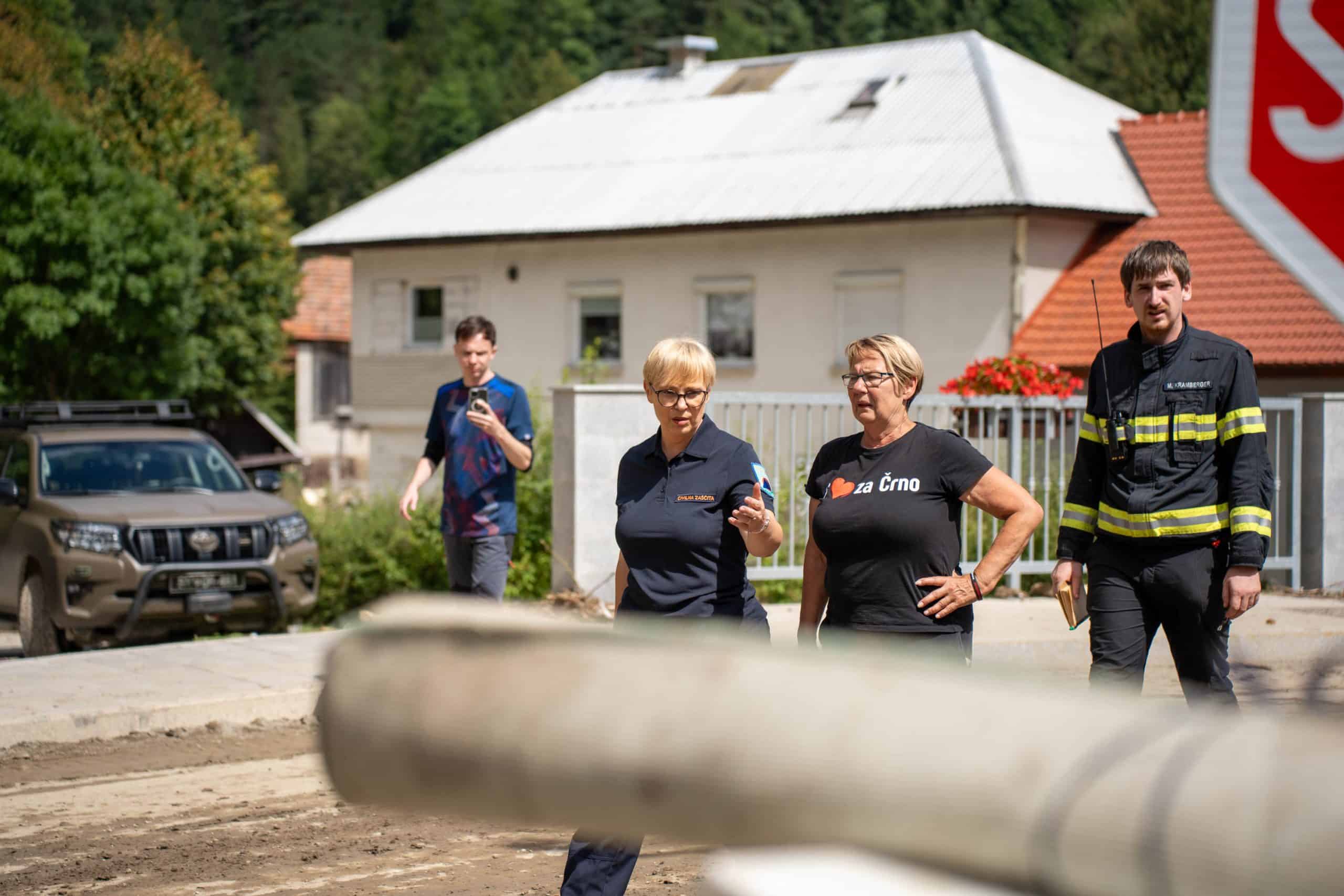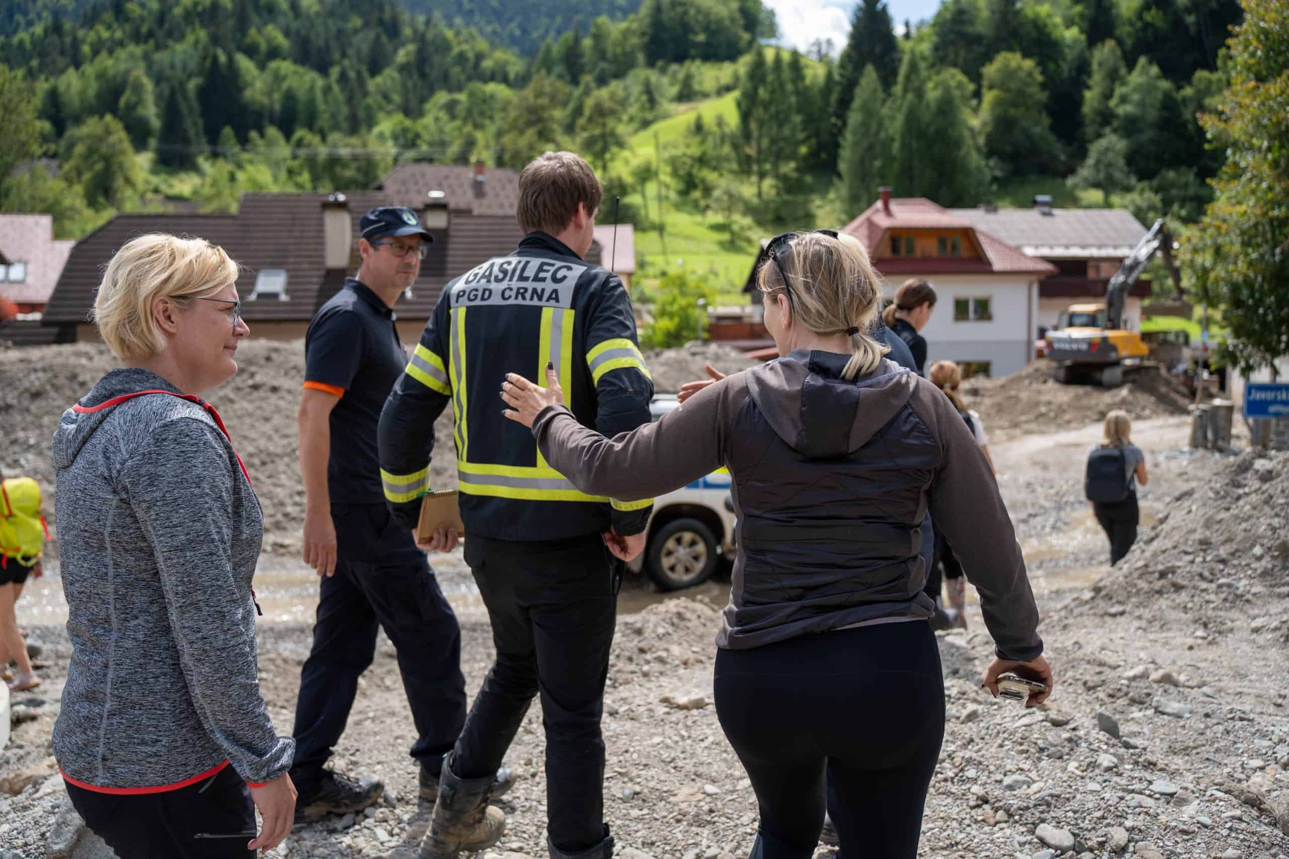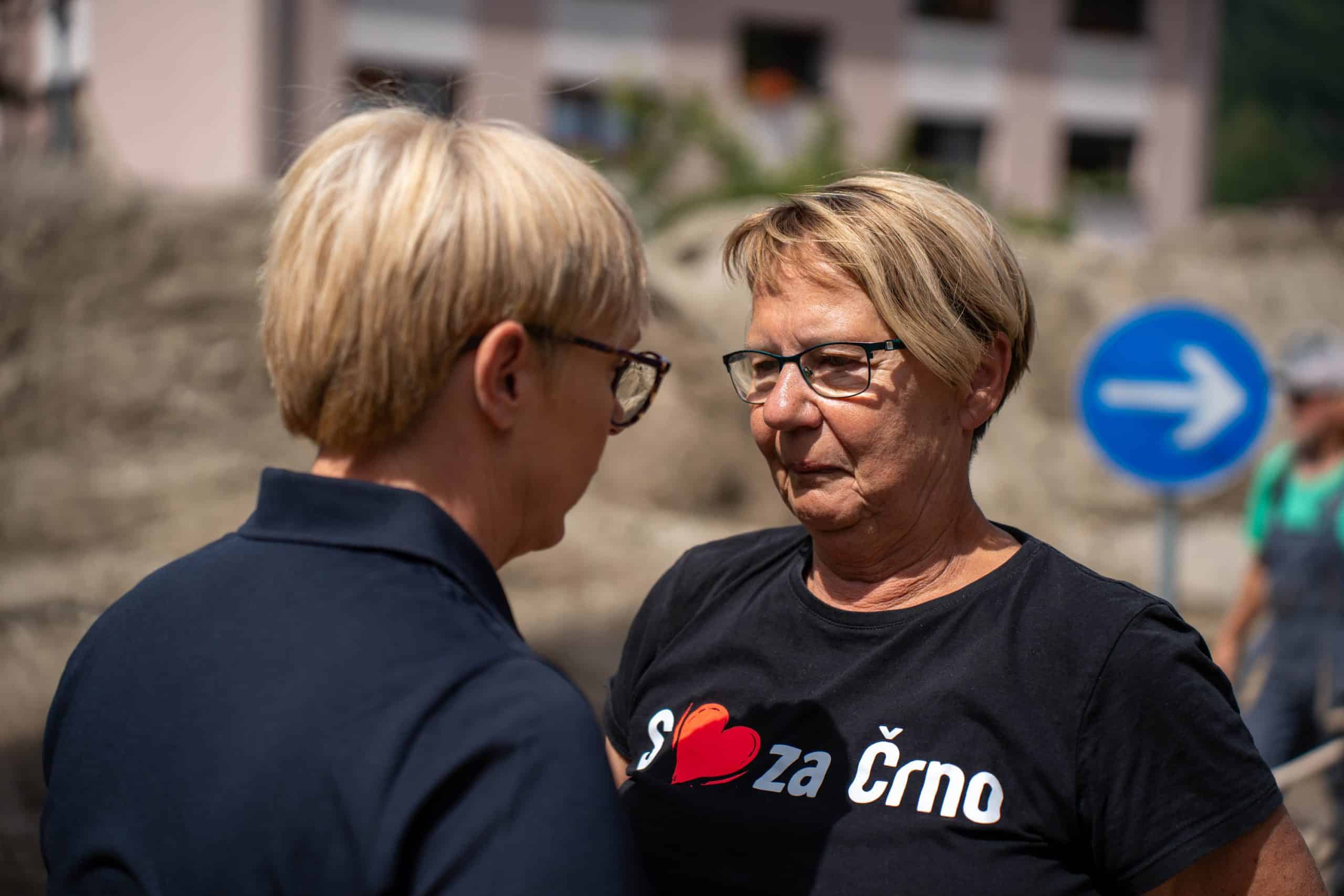 Na Ravnah na Koroškem se je srečala s prebivalkami in prebivalci, predstavniki lokalnih skupnosti, Civilne zaščite in gasilci in si ogledala posledice hudih poplav, ki so močno prizadele našo regijo. V spremstvu župana dr. Tomaža Rožena, podžupana Petra Stočka, poveljnika Branka Kakerja, dela CZ Štaba Občine Ravne je pozdravila tudi mnoge prostovoljce in si ogledala stanje.