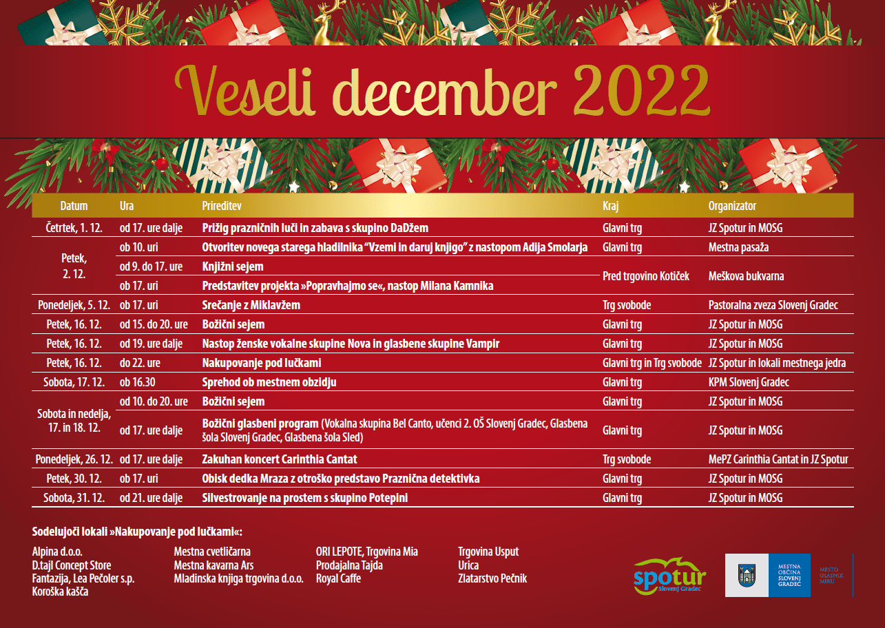 Na odru je, skupaj z občinstvom do pričetka "Veselega decembra v Slovenj Gradcu", do prižiga lučk, odšteval župan Mestne občine Slovenj Gradec, g. Tilen Klugler, ki je dejal, da je december tisti čas, ko mestno jedro zasije v tisočih lučkah. Župan je še vsem zaželel veseli december ter vse povabil na prihajajoče dogodke, ki so jih pripravili.