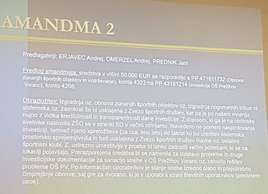 Naj spomnimo, da je bil na 4. redni seji občinskega sveta Občine Ravne na Koroškem, vložen tudi amandma, ki pa ni bil sprejet. V njem so predlagatelji Andrej Erjavec, Jani Prednik in Andrej Omerzel predlagali, da se sredstva za preureditev tribune prerazporedijo in namenijo sanaciji športne dvorane. Andrej Omrzel je na seji tudi poudaril, da je potrebno najprej poskrbeti za otroke, ki uporabljajo športno dvorano pri OŠ Prežihovega Voranca in jim po njegovih besedah teče voda na glavo, nato pa še le za peščico navijačev, ki bi jim bila pokrita tribuna namenjena.