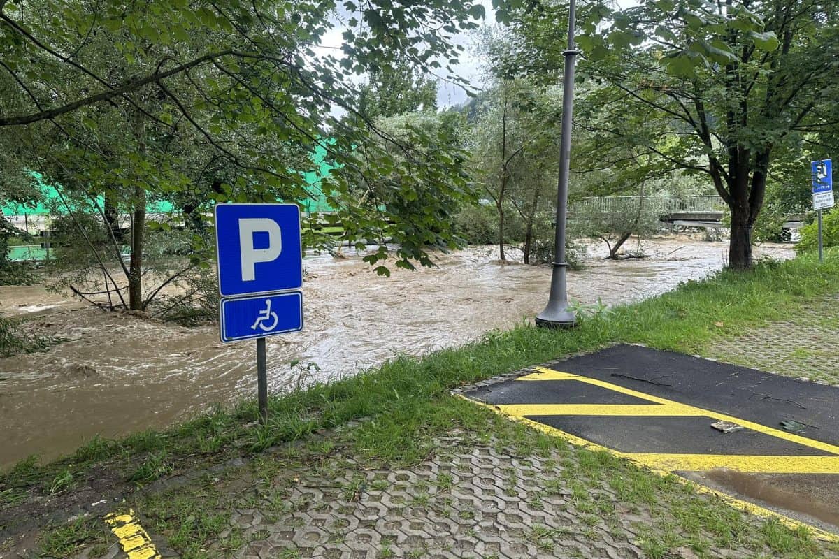 16.34 - Avtobus francoskih državljanov zataval na parkirišče pred Sparom v Slovenj Gradcu in se znašel sredi vode. Vračali so se z velenjskega festivala.