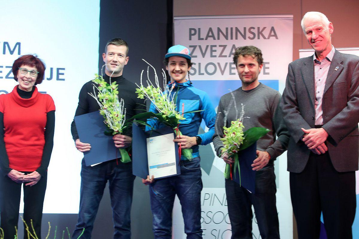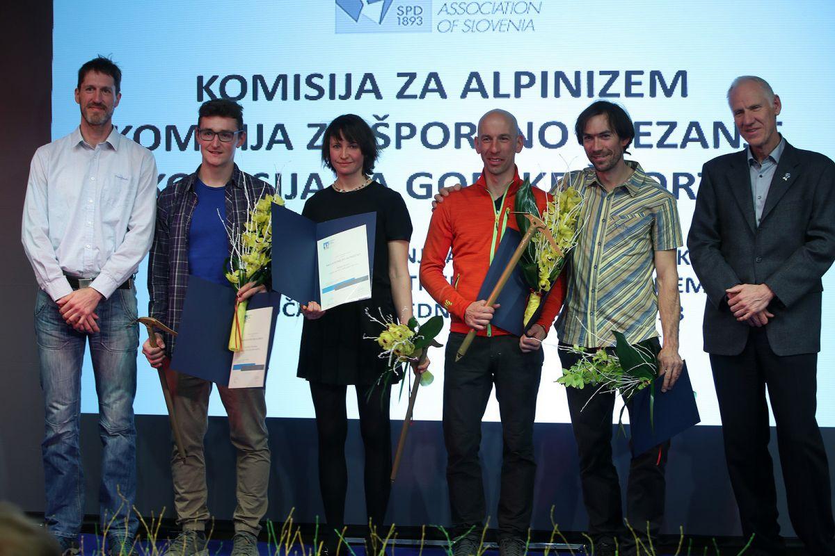 Prejemniki priznanj za vrhunske dosežke v alpinizmu Matevž Štular, Marija Jeglič, Luka Stražar in Aleš Česen z načelnikom KA PZS Petrom Bajcem in predsednikom PZS Jožetom Rovanom[/caption]