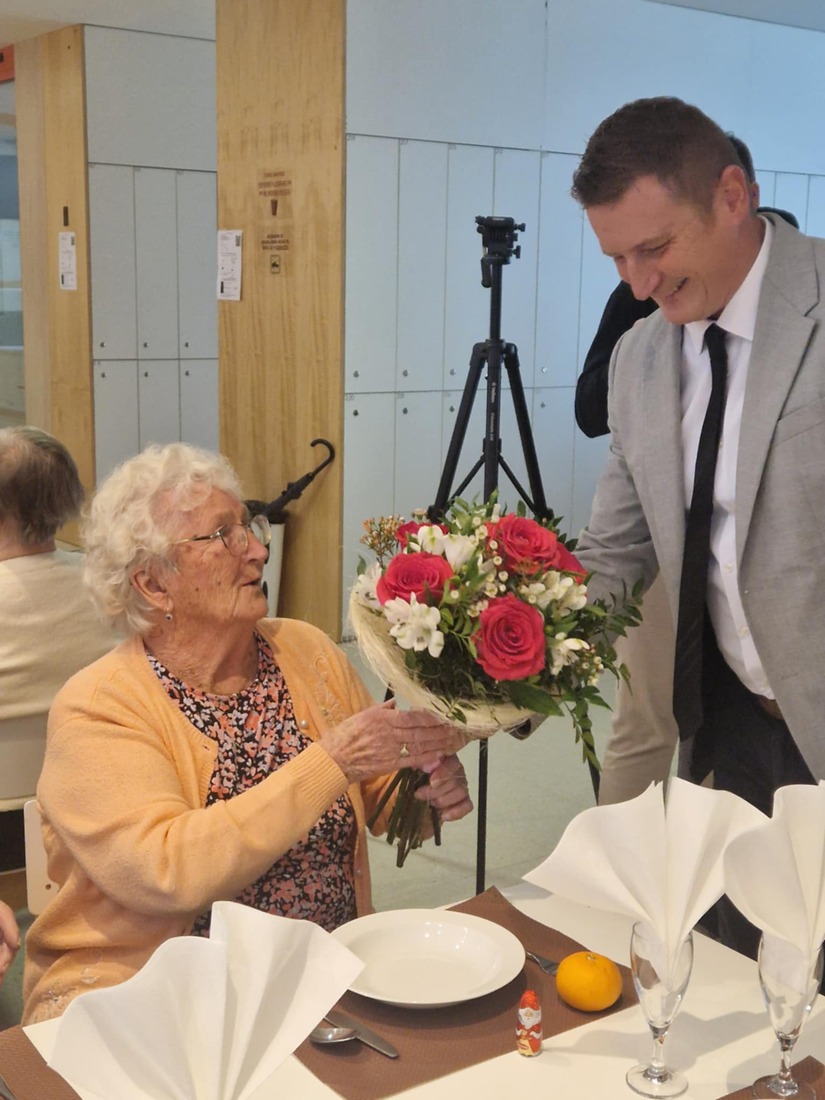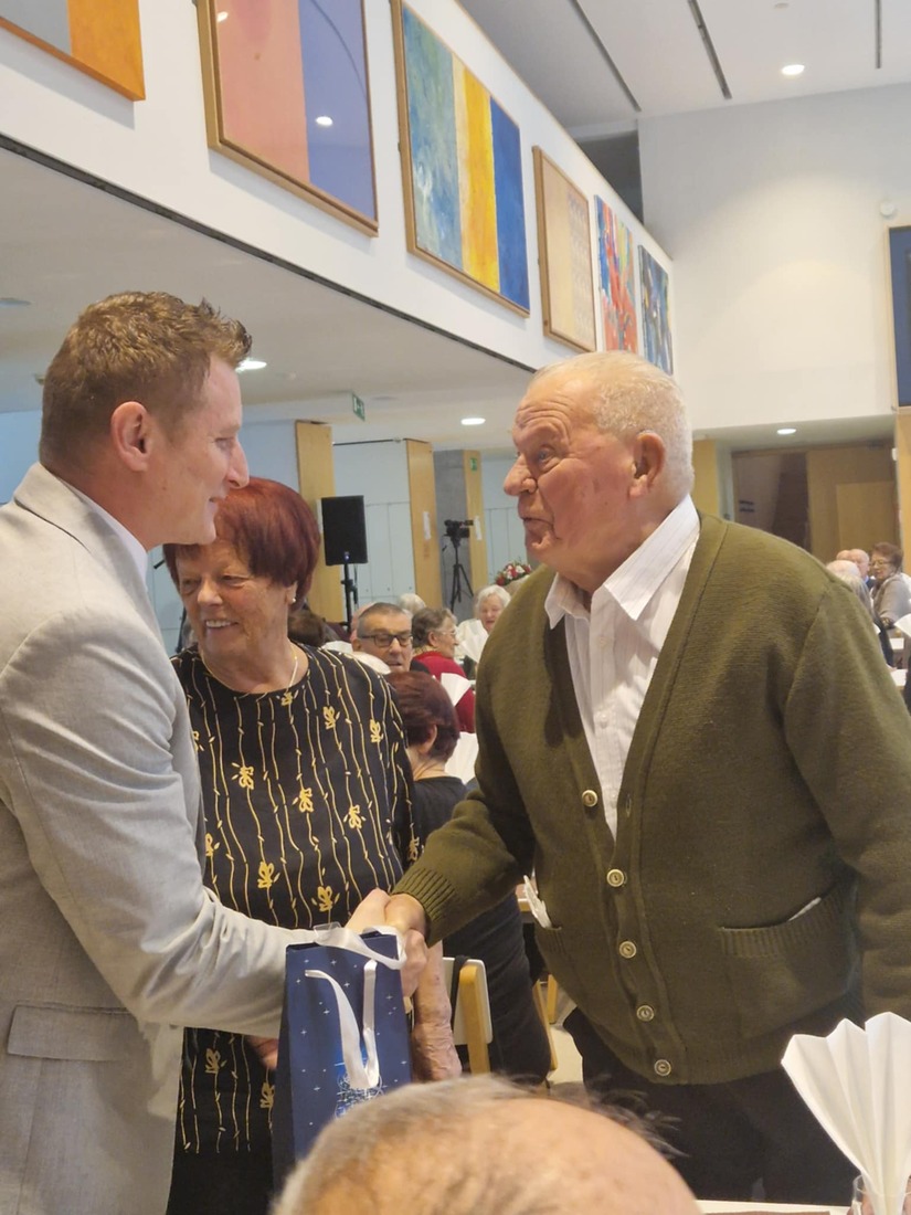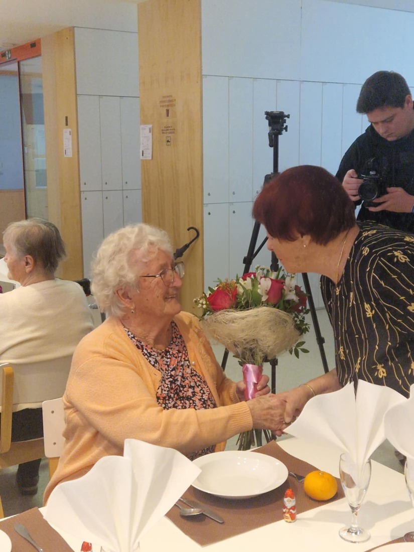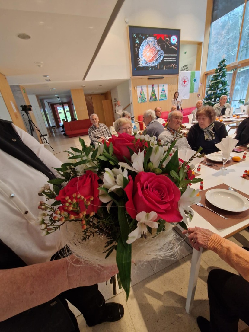 Rdeči križ je tudi letos pripravili majhno pozornost za najstarejša udeleženca srečanja – gospo Homan in gospoda Čekona. Darilo so jima skupaj predali podžupan Andrej Erjavec, Magdalena Piko in Franja Mlakar.