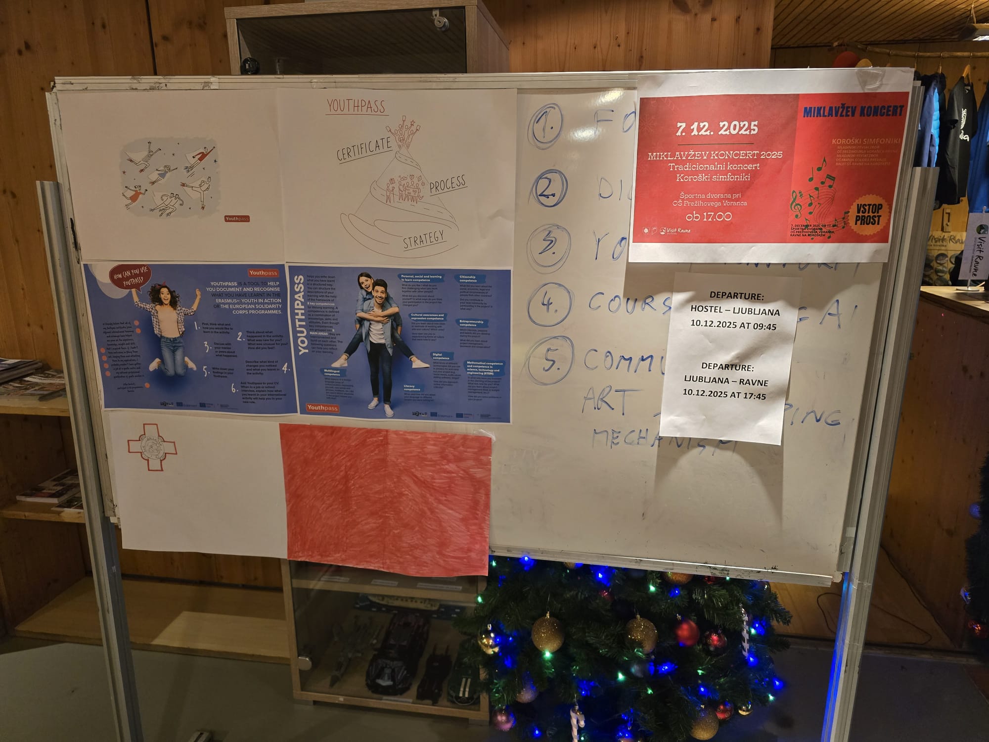 Različna društva in organizacije, predvsem na Ravnah in v okolici so aktivno sodelovale pri organizaciji številnih delavnic mladinske izmenjave, ki jih je vodila mladinska delavka Tjaša Gorenc: mladi so se med drugim preizkusili v peki štrudla v Koroškem medgeneracijskem centru, odkrivali mesto, prisluhnili delavnici na temo umetne inteligence Dogs4motion (Primož Gams je organiziral zelo poučno delavnico), imeli športni dan v športnem centru Ravne, se prepustili meditaciji Tjaše Gorenc, odkrivali čare Pece na avstrijski strani (obiskali so najvišje ležeči božični sejem), se udeležili dogodka ''Miklavžev tek po cik caku'', v prostem času so se nekateri mladi spustili po najdaljši jeklenici v Sloveniji ter obiskali druge kraje po Sloveniji – ekskurzija v praznično, predbožično Ljubljano. Obiskal jih je tudi Miklavž.